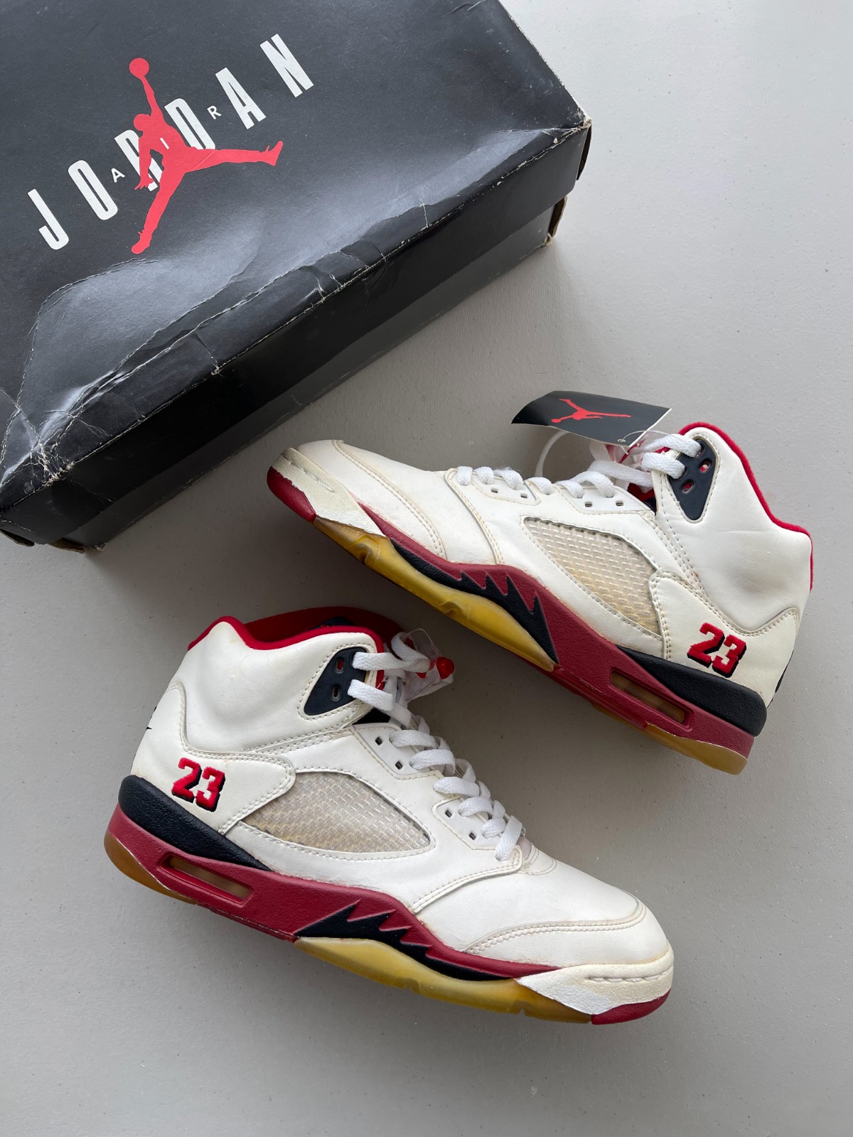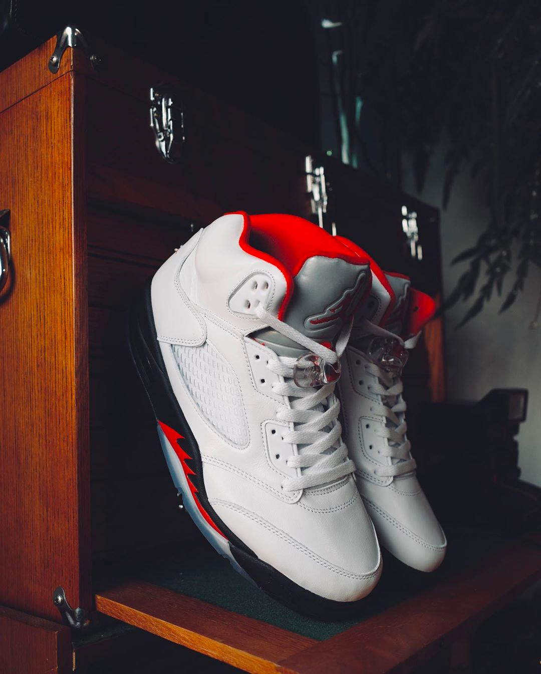 后跟带有 23 号刺绣的白红 Air Jordan 5,上一次复刻还是 10 年前的 2013 年。
