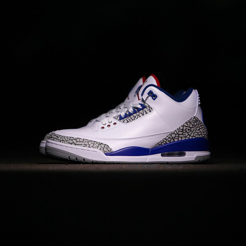 除了去年 OG 火焰红和今年 3 月 11 日确定回归的白水泥外,Air Jordan 3 如果再复刻元年配色,就该轮到眼前这双白蓝了。