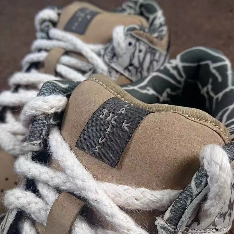 整双鞋依旧采用 Travis Scott 最爱的大地色系呈现,鞋身框架与内衬均点缀了 TS 联名特有的裂纹设计,与腰果花鞋面撕开后的效果几乎一模一样。