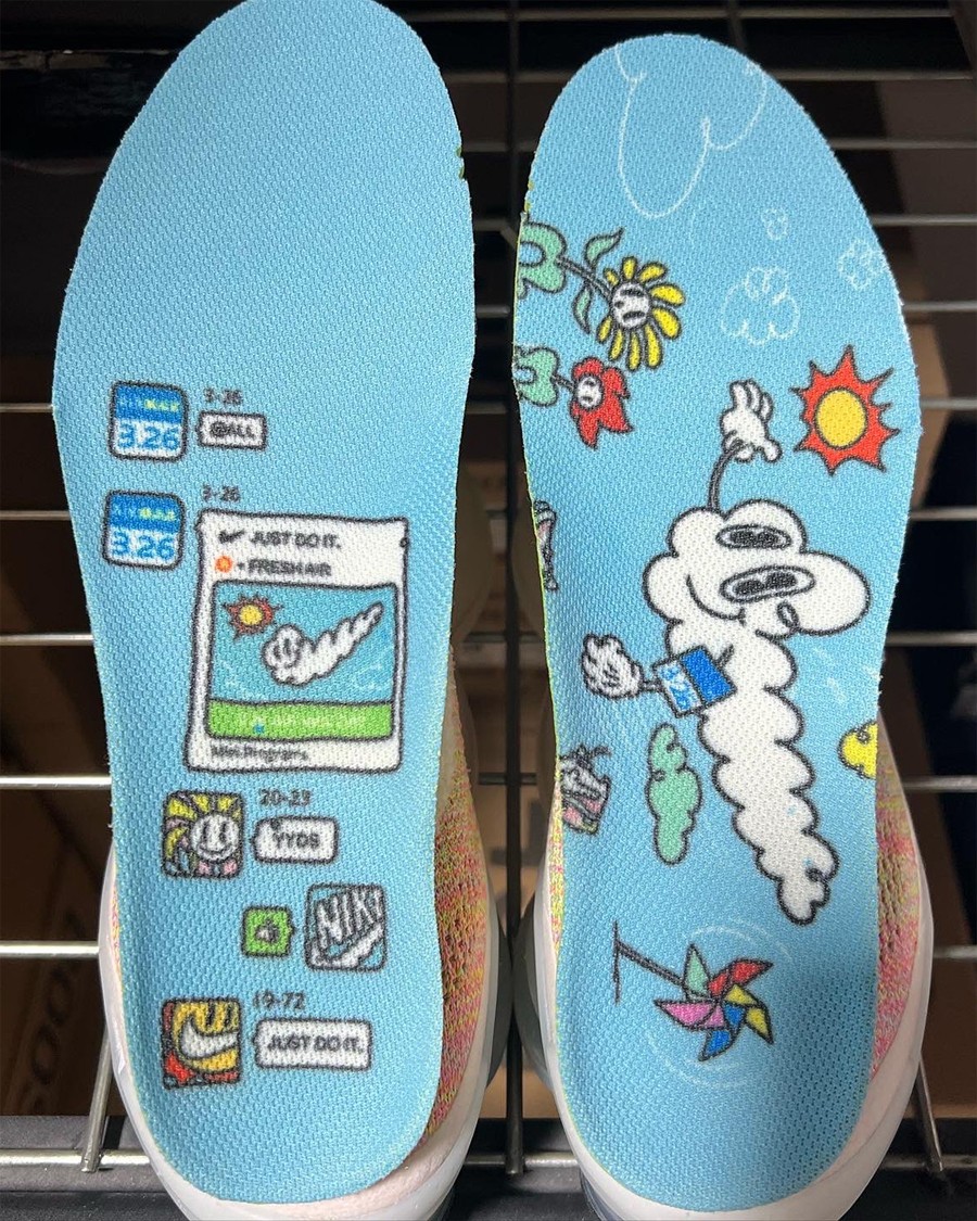 天蓝色的鞋垫造型也同样值得一提,左右脚分别点缀有聊天记录与云朵小花图案,并且在聊天记录中还可以看到「YYDS」和「JUST DO IT」字样,不仅玩梗还展现出了品牌标语!
