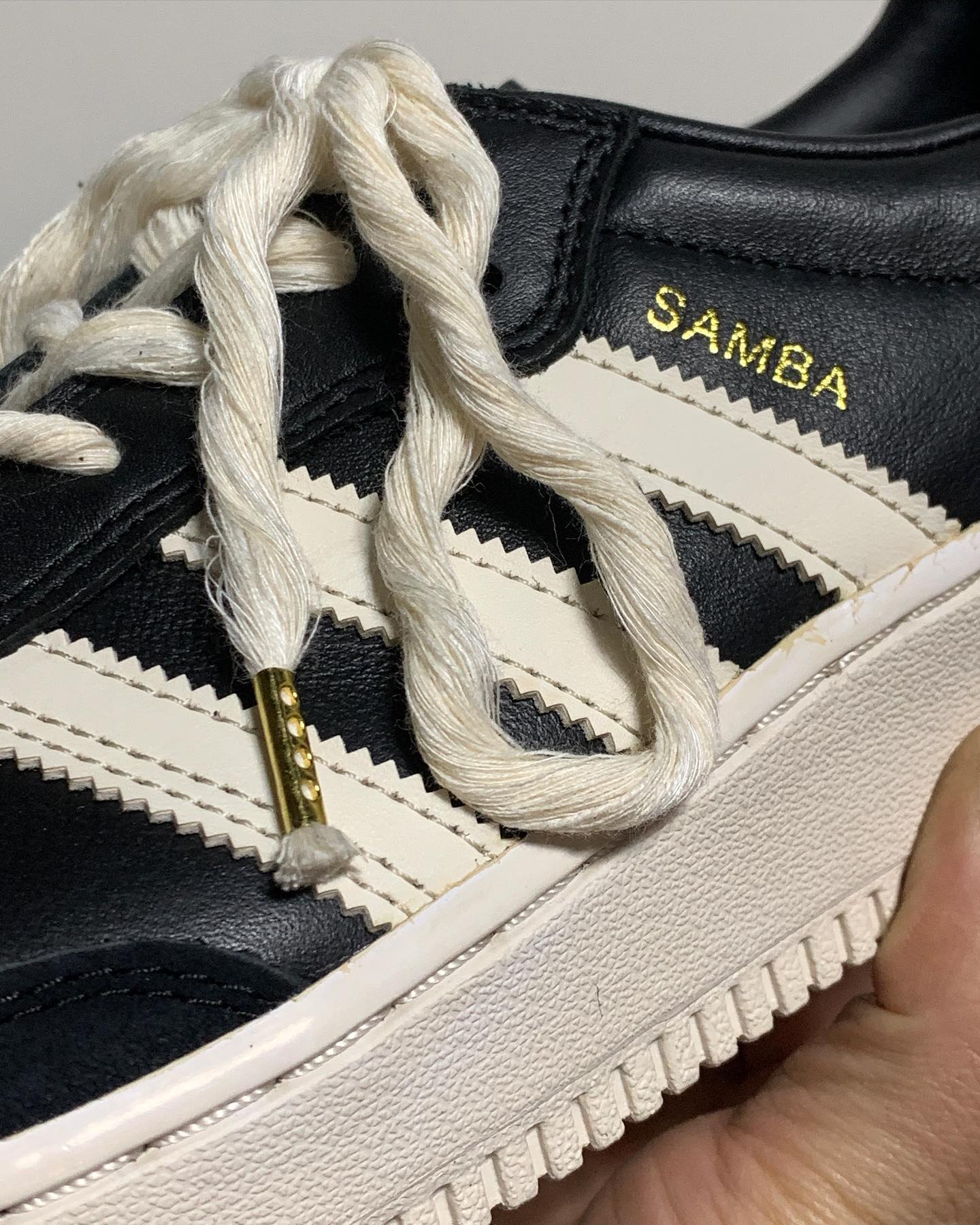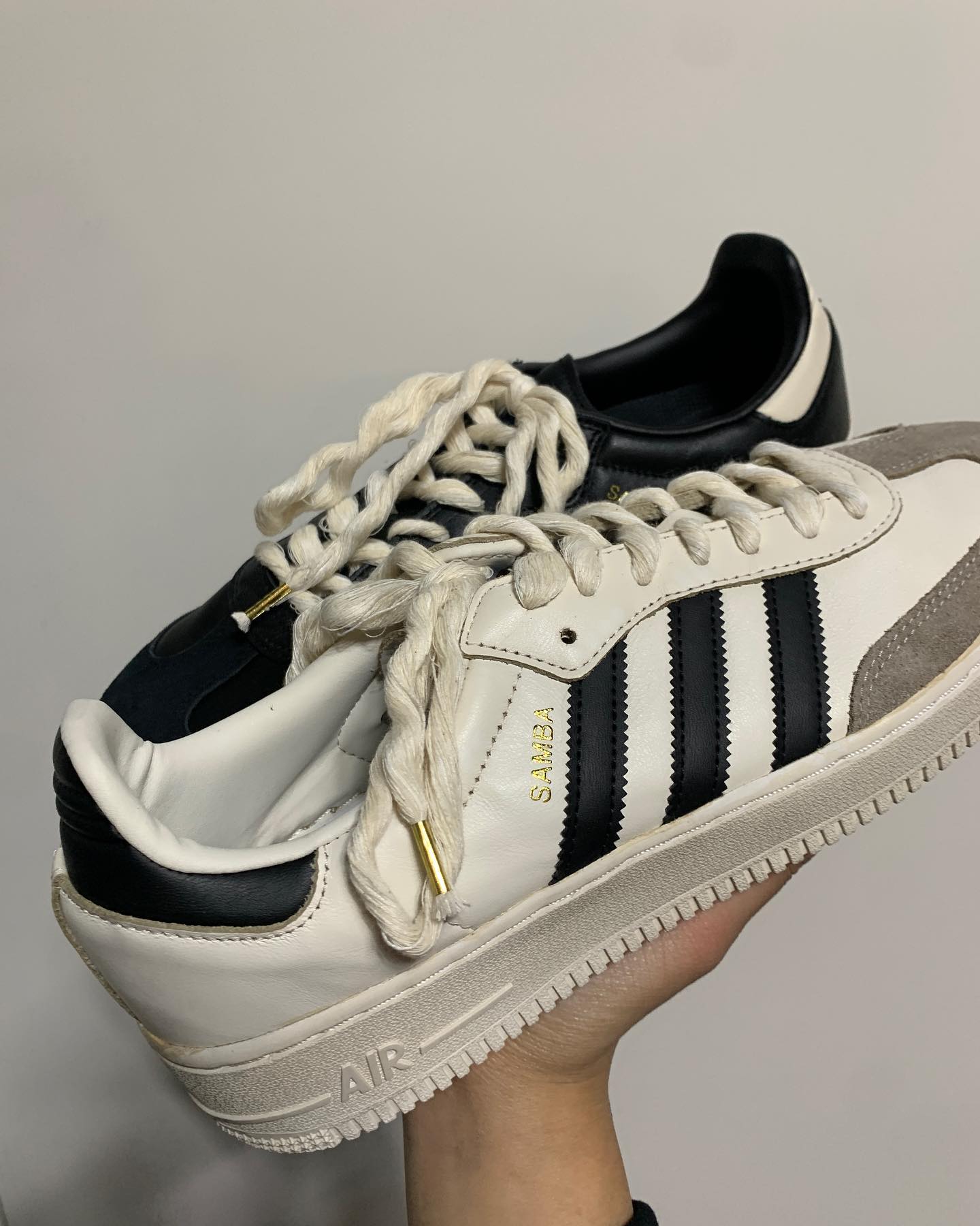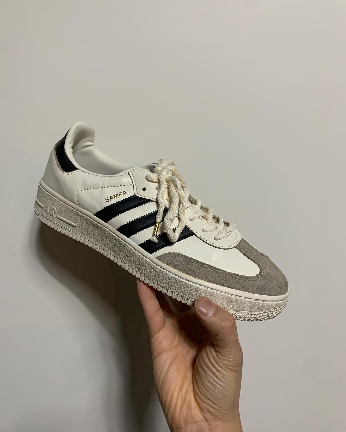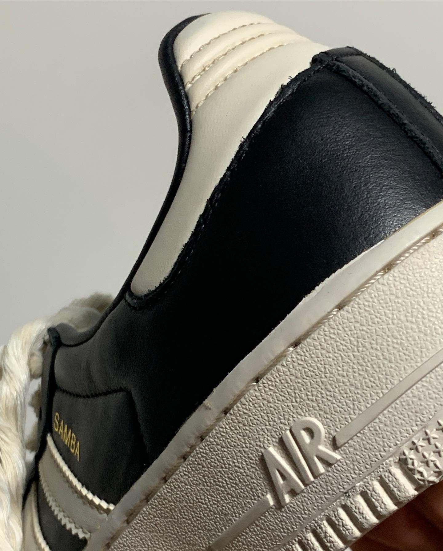 他选用了 adidas 最为经典的 Samba 鞋型,以及 Nike 最为流行的 Air Force 1 鞋型,简单直接的将 AF1 鞋底给 Samba 换上。