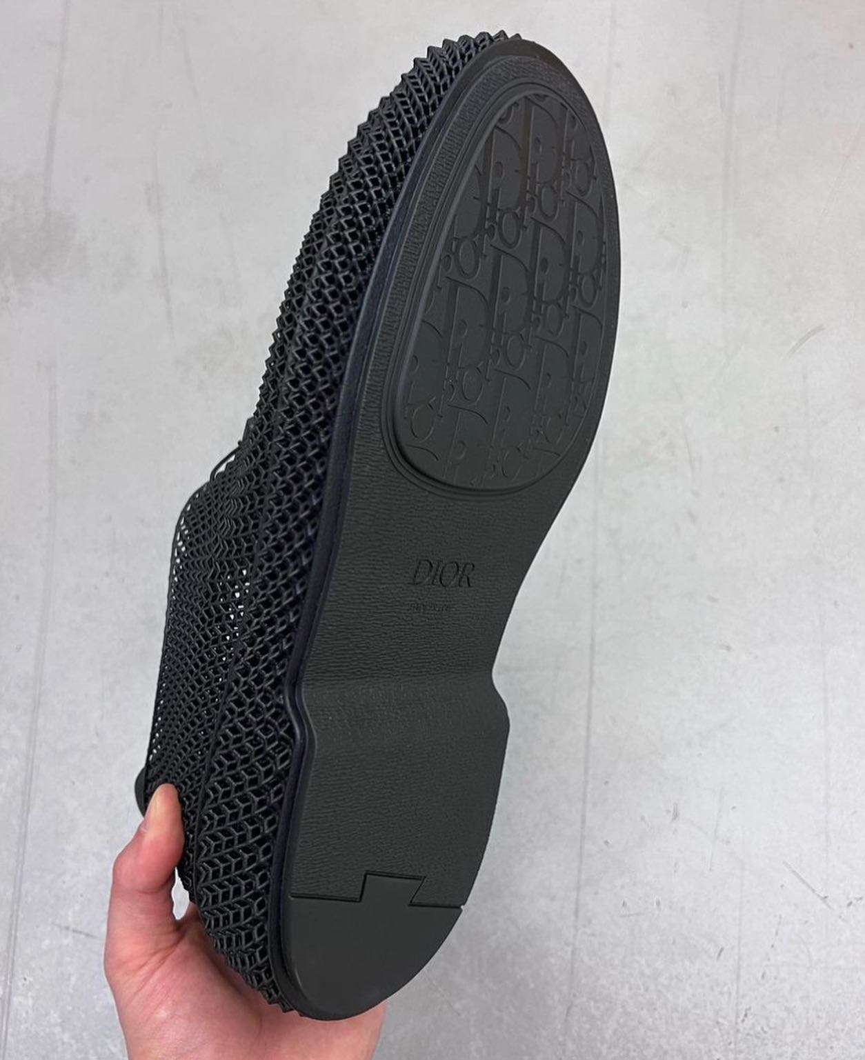 但值得注意的是,Dior 从鞋底到鞋面都采用了 3D 打印,整体呈现出蜂窝状的质感。