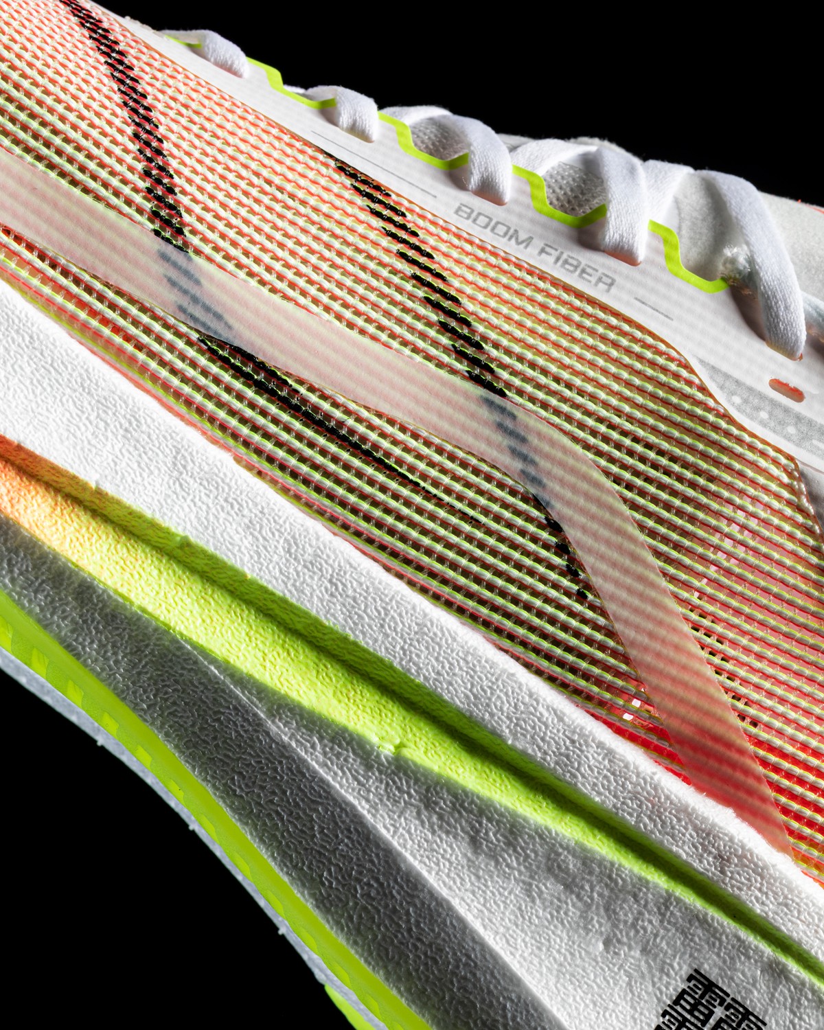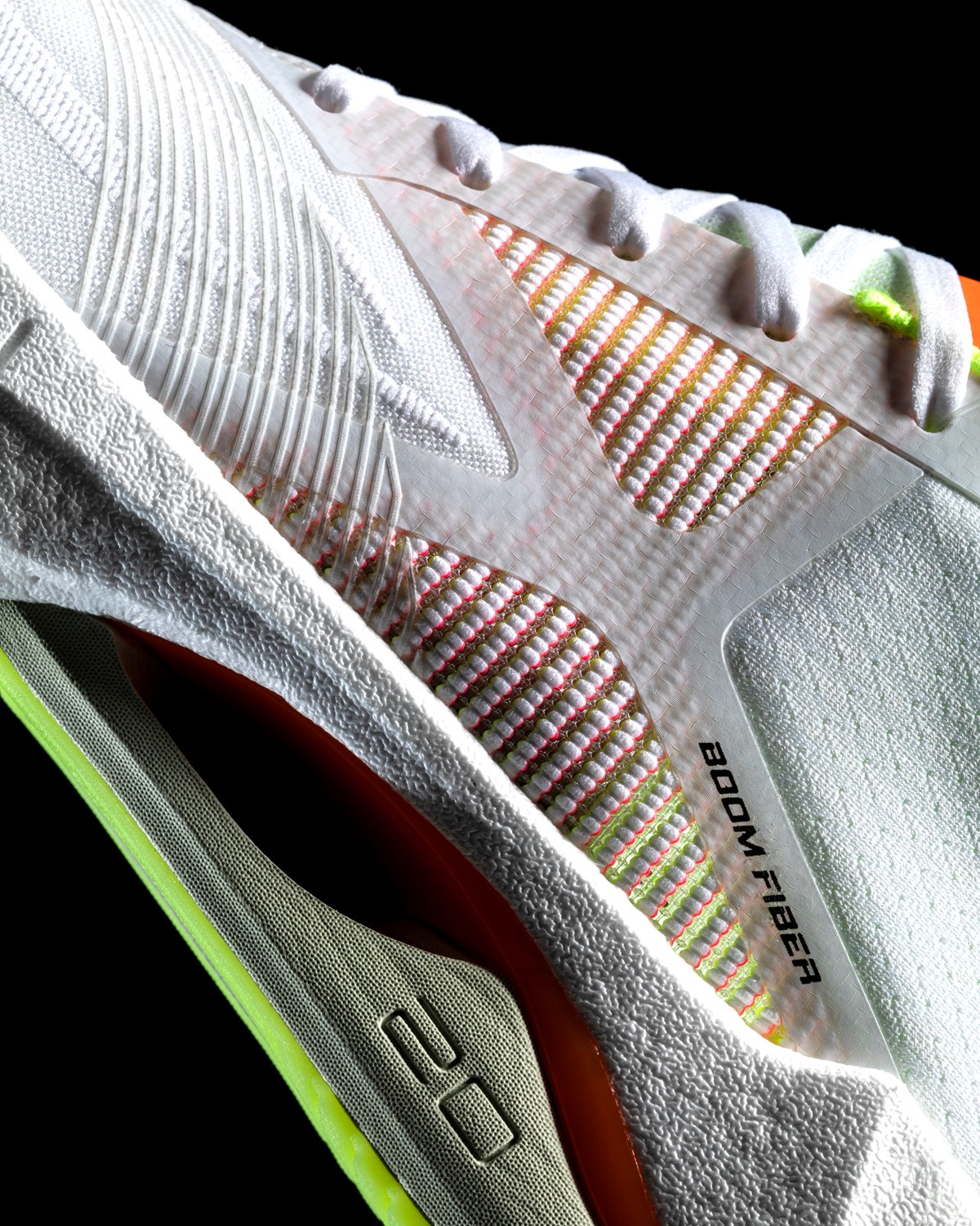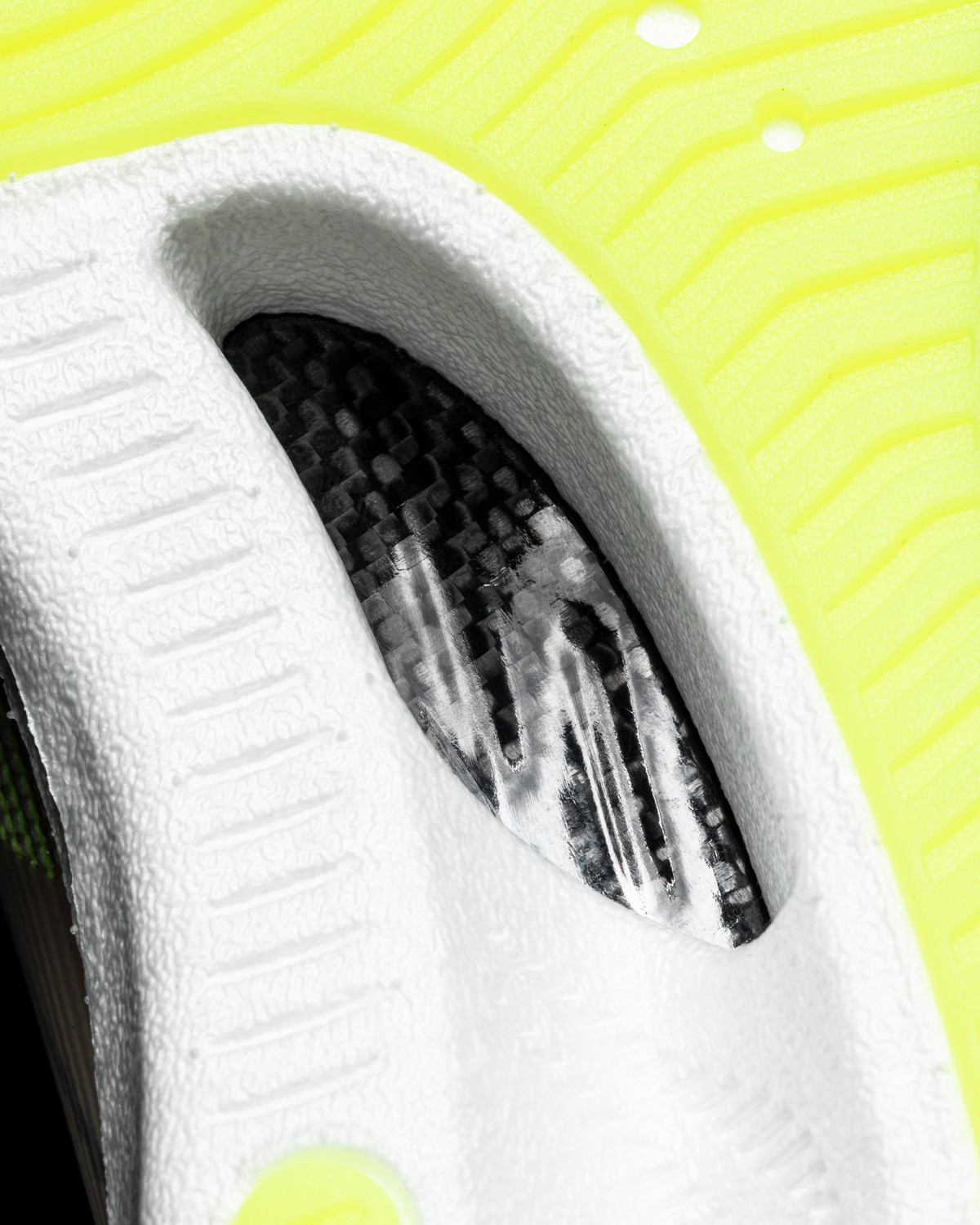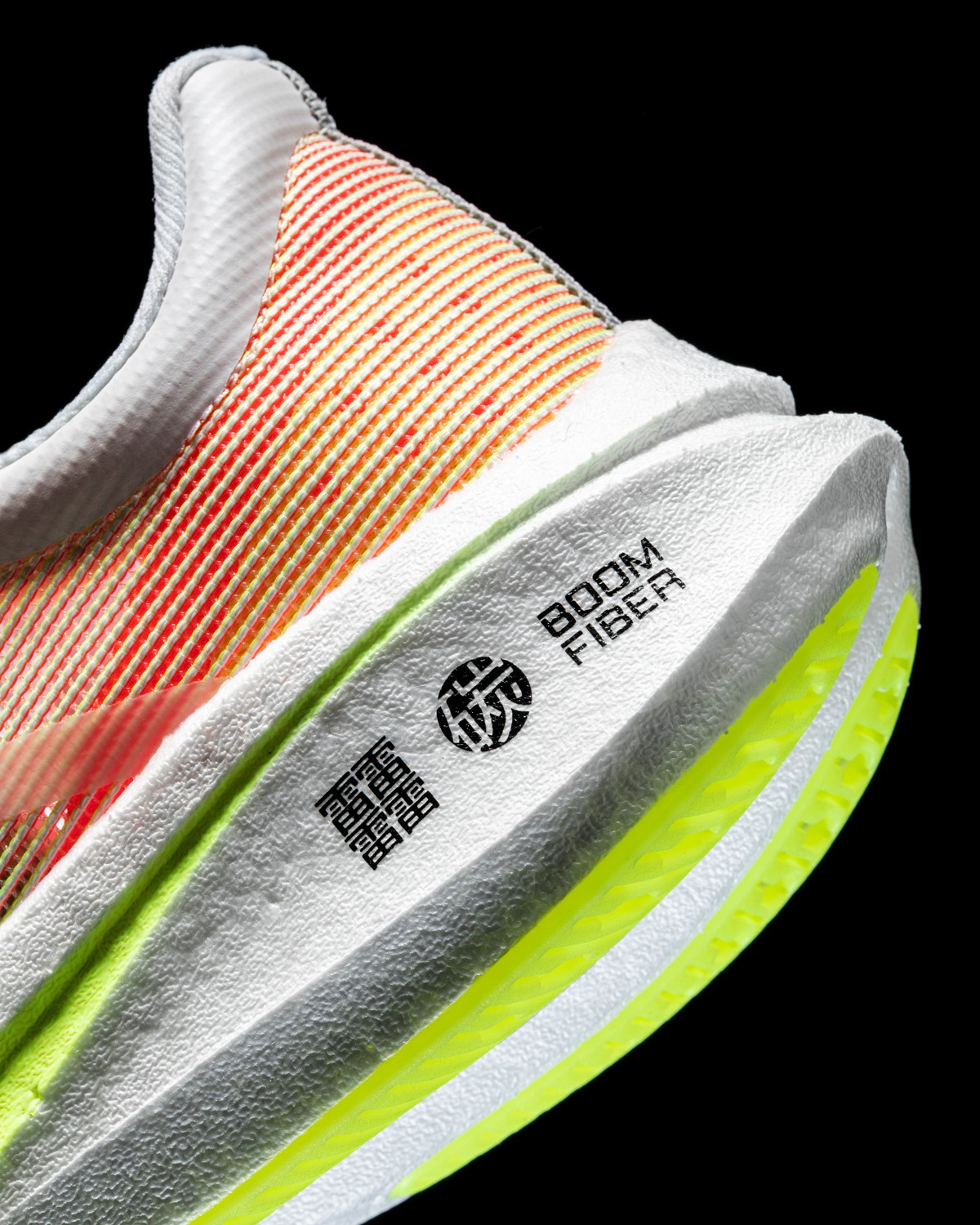 更爽的是,内置碳板进化为拥有四根加强筋的全掌异构碳板,搭配更大上翘的前掌角度,赋予强力的推进感。