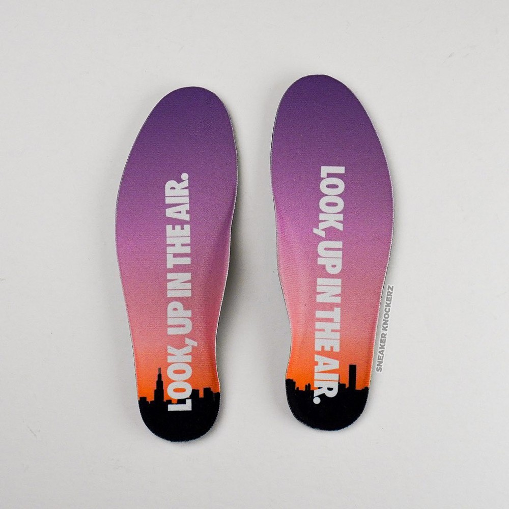 虽然外表低调,但鞋垫却暗藏闷骚,以乔帮主芝加哥天际线背景色调打造,并写有「LOOK,UP IN THE AIR」。
