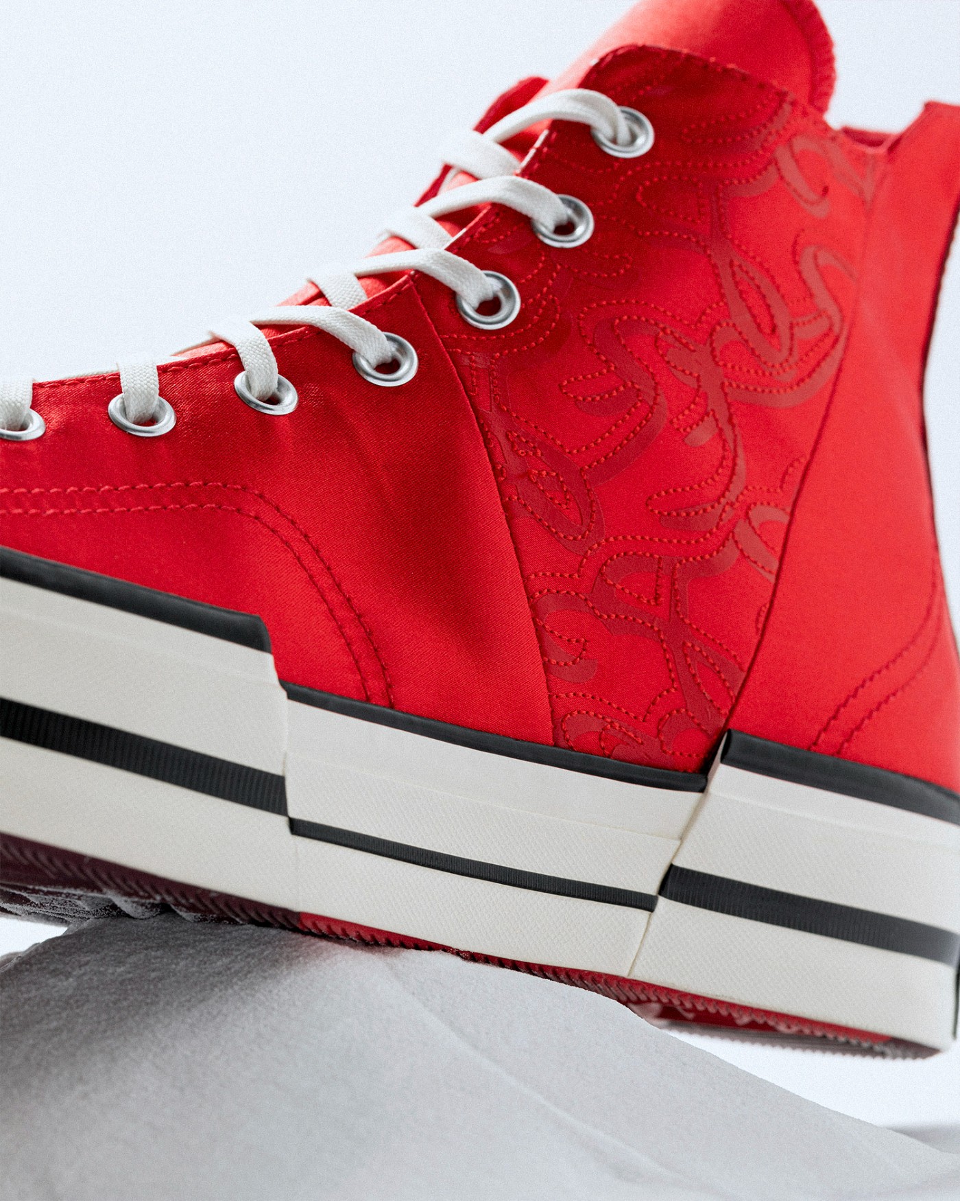 特别要说到鞋面,丝滑细腻的绸面材料带来「红丝绸」般的质感表现,再加上暗红色印花,释放出中式旗袍般的端庄典雅。