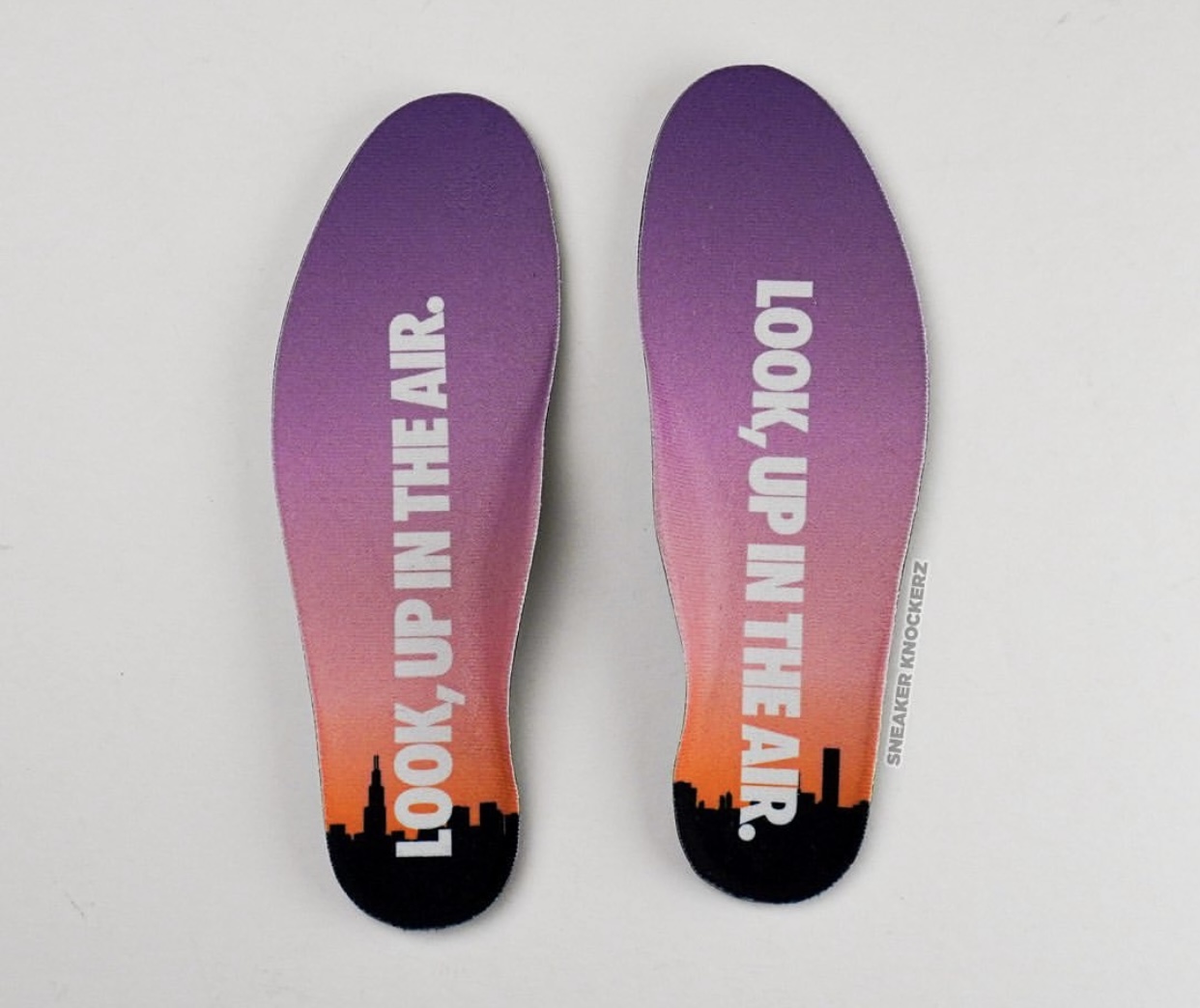 要说最大的亮点,那一定是鞋垫了,整体从紫色到橙色的渐变设计,设计灵感似乎来自乔帮主以芝加哥天际线为背景的扣篮照片。