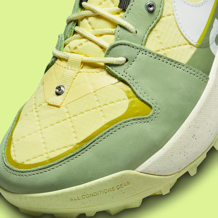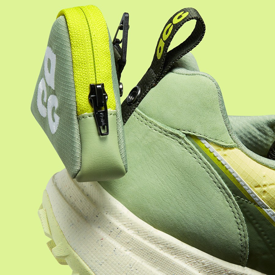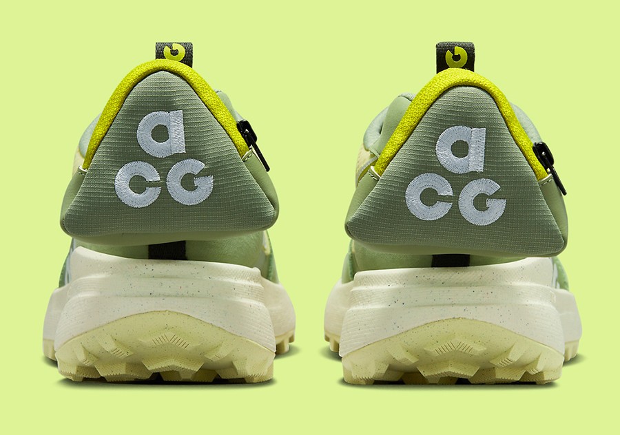 整双鞋采用两种明度不同的绿色组成,造型格外醒目,同时也符合了 ACG 一贯的户外风格。