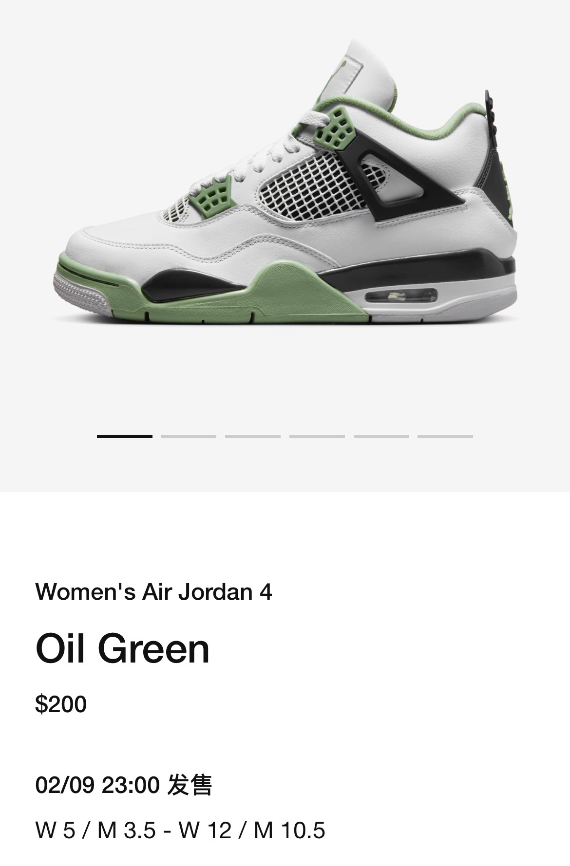 据悉,全新 Air Jordan 4 “Oil Green” 仅为 WMNS 规格,将于 2 月 9 日发售,发售价格为 $200 美元,目前已经在美区 SNKRS APP 上架预告,感兴趣的小伙伴可以多多关注一下。