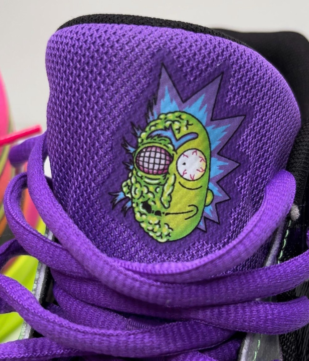 整双鞋依旧选择鸳鸯设计呈现,左脚使用紫色、绿色点缀,并在鞋舌外侧上带有 Rick 的头像,内侧写有 Rick 口头禅「WUBBA LUBBA DUB DUB!!」字样。