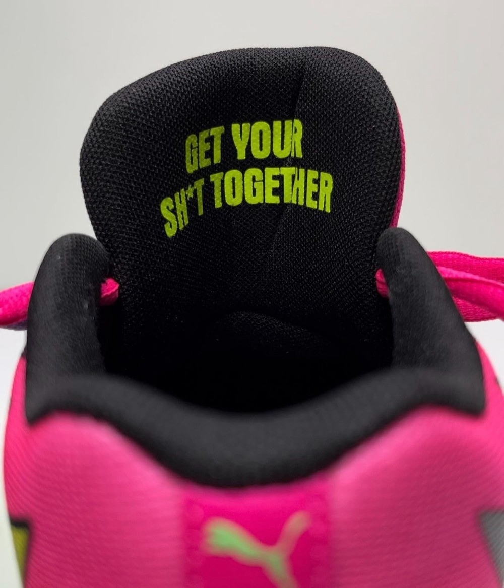 右脚则采用粉色和荧光黄色打造,鞋舌内外同样缀以 Morty 头像及其「GET YOUR SH*T TOGETHER」。