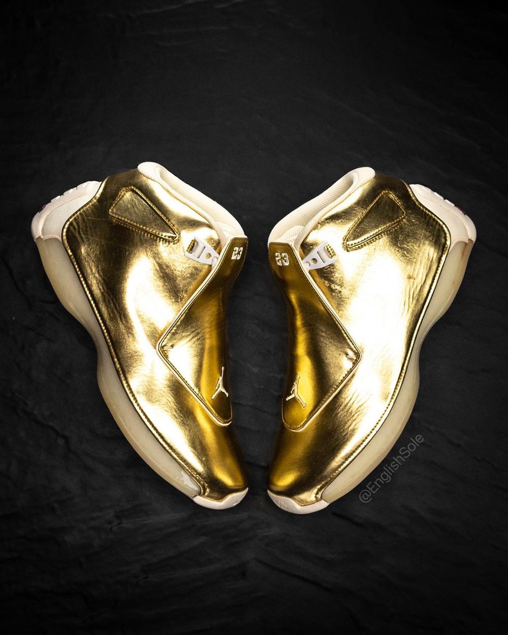 除此之外在 2017 时,Jordan Brand 还打造过一双 Air Jordan 18 OVO “Gold”,整双鞋采用通体电镀金色呈现,切合了 OVO 一如既往的造型设计。