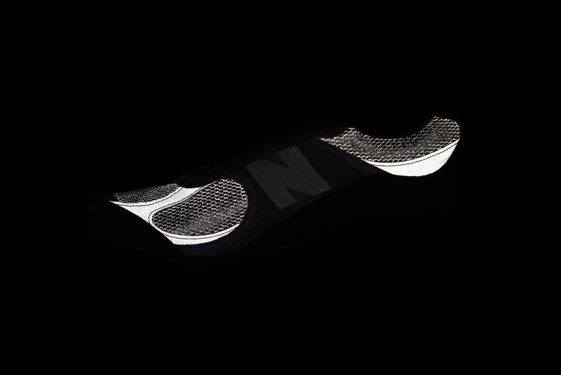 鞋头与鞋跟两侧的深灰色皮革也加入了 3M 反光,在暗光下有更好的视觉效果。
