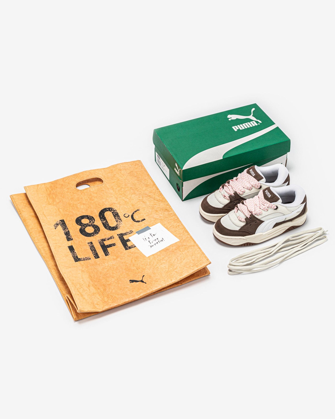 最后则是整双鞋款最为重要的特殊包装,牛皮纸质感的手提口袋,正面写有「180℃ LIFE」字样,造型格外讨喜。