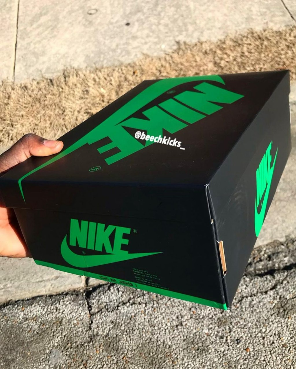 就连鞋盒都呼应鞋款配色,将元年经典的红色 Logo 换成了鞋身的绿色。