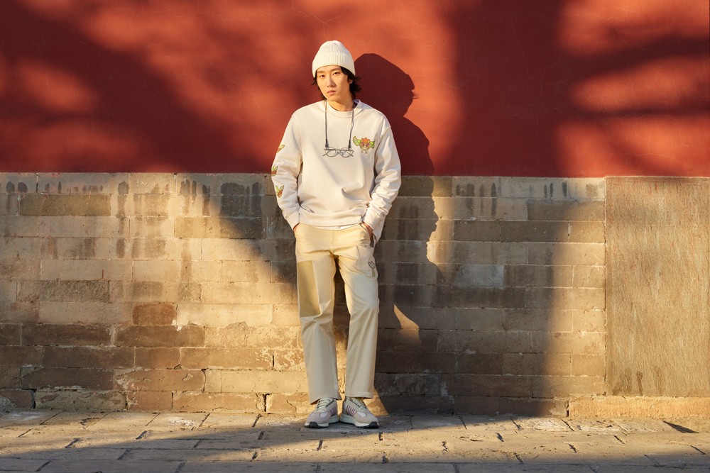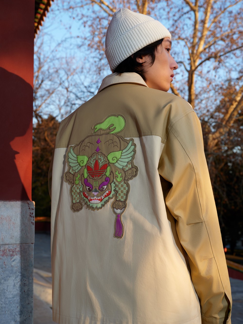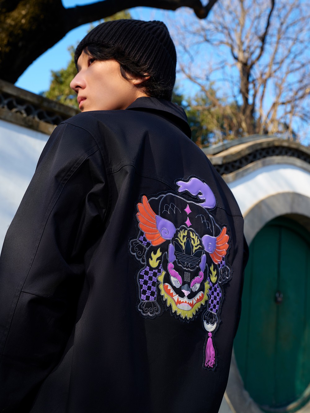 每件单品的辨识度都相当高,尤其是这件夹克,后背装饰超大贴布元素,并巧妙将三叶草 Logo 与神兽融合。
