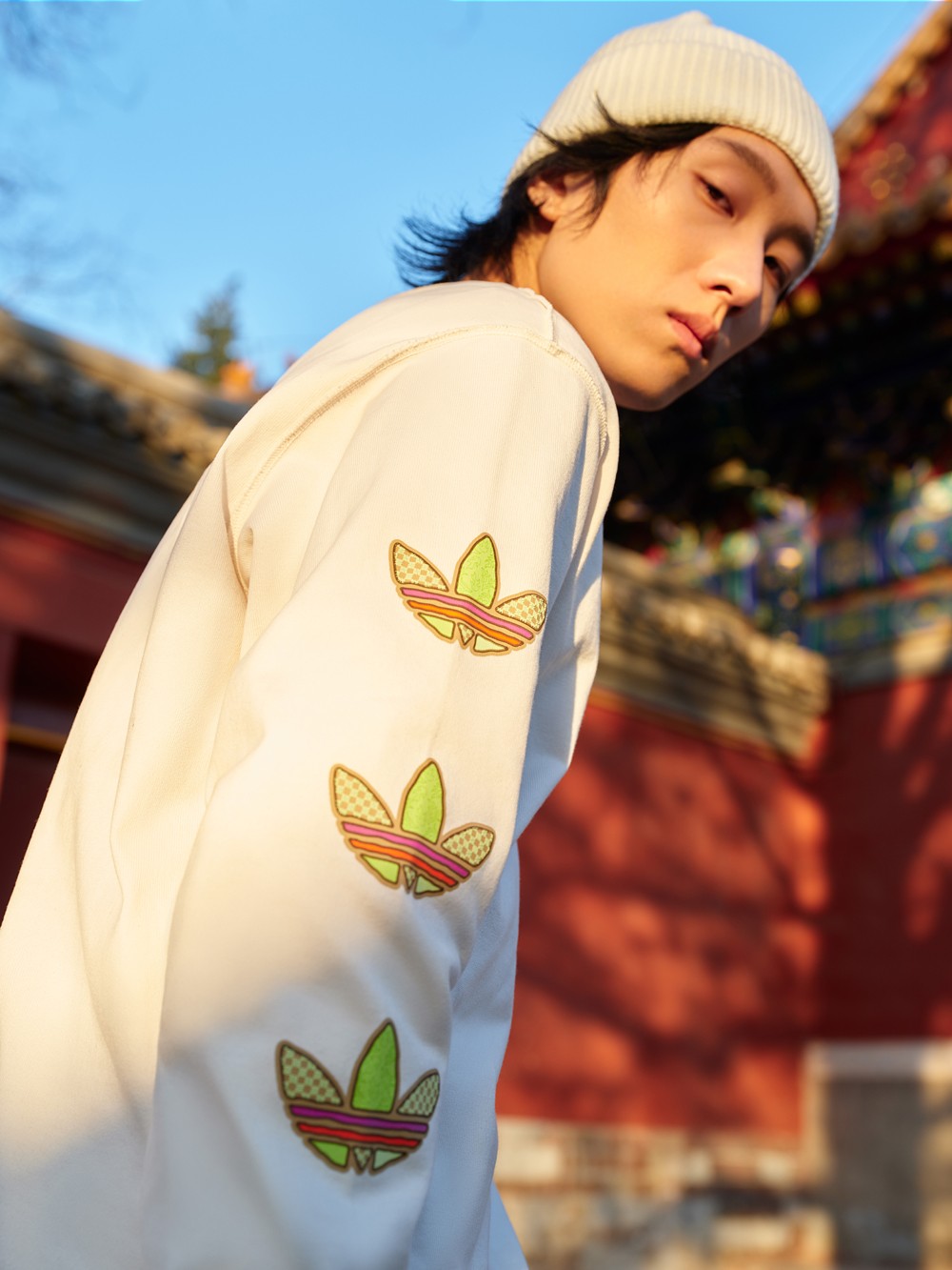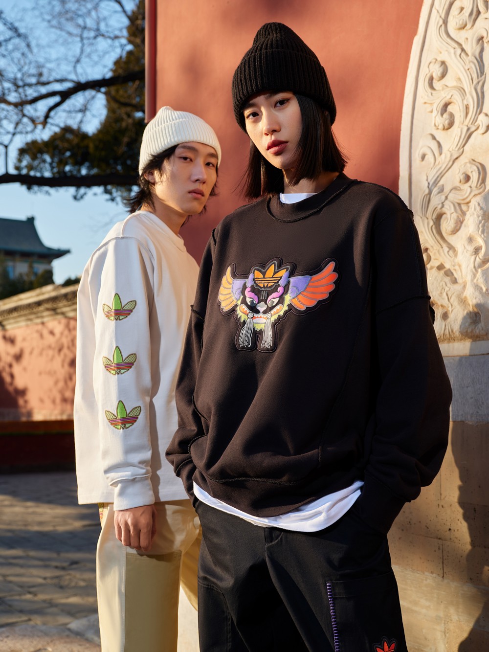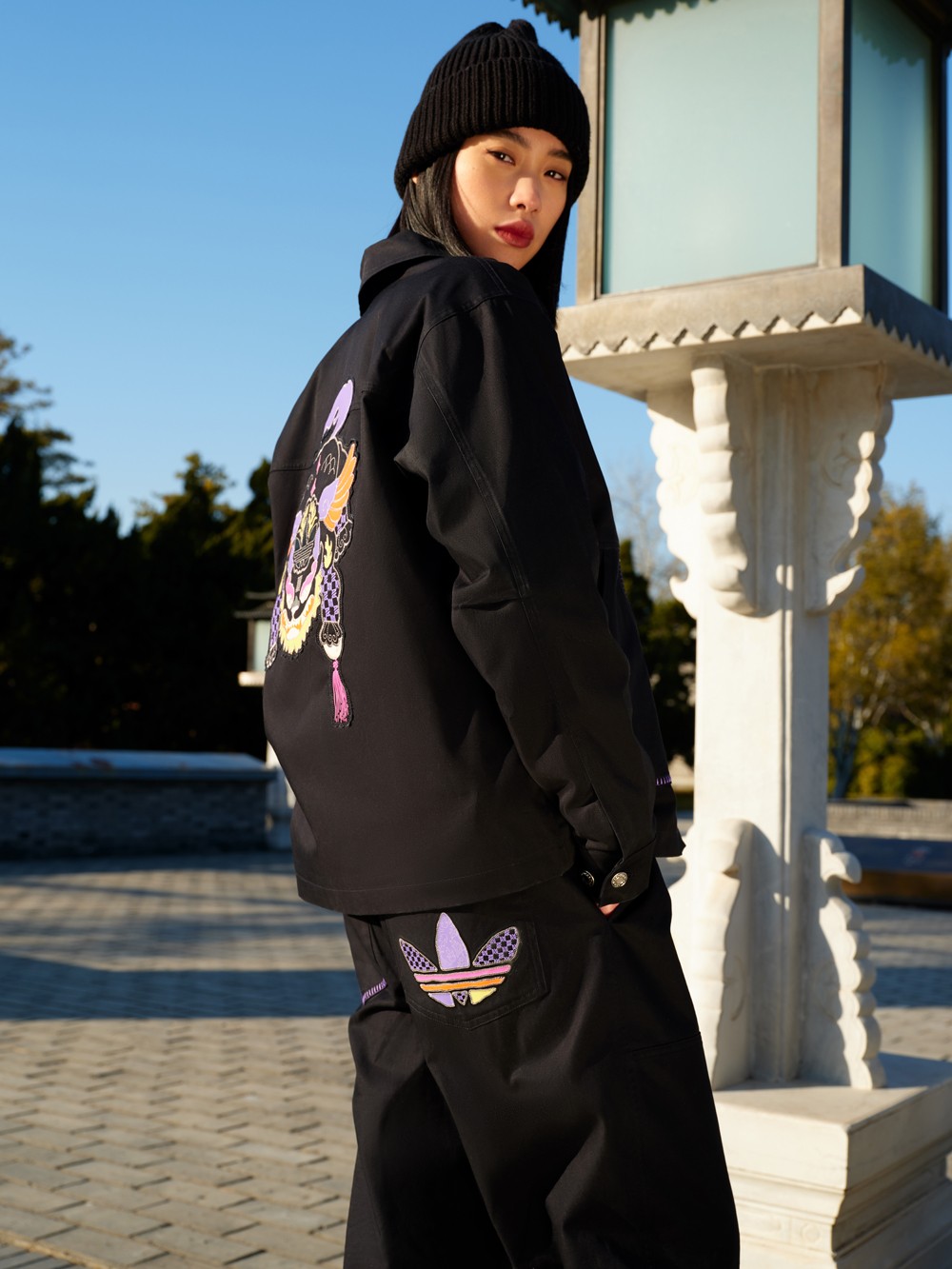 每件单品的辨识度都相当高,尤其是这件夹克,后背装饰超大贴布元素,并巧妙将三叶草 Logo 与神兽融合。