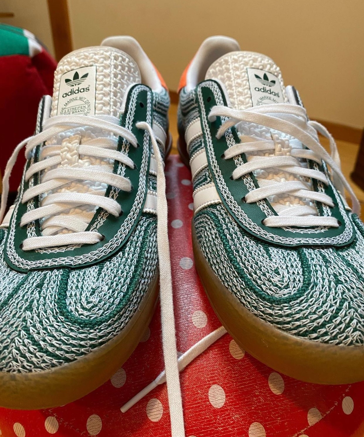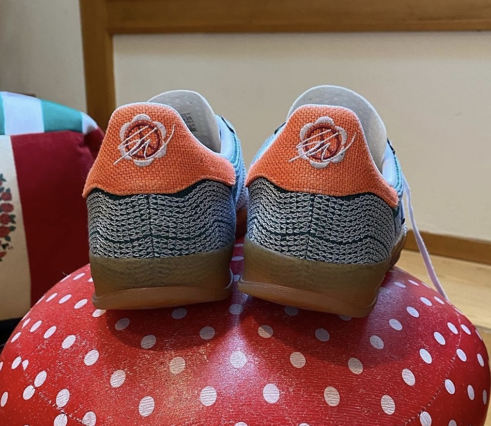 整双鞋以 adidas 经典的 Gazelle 鞋型为蓝本设计,采用绿色和白色搭配,橙色点缀。