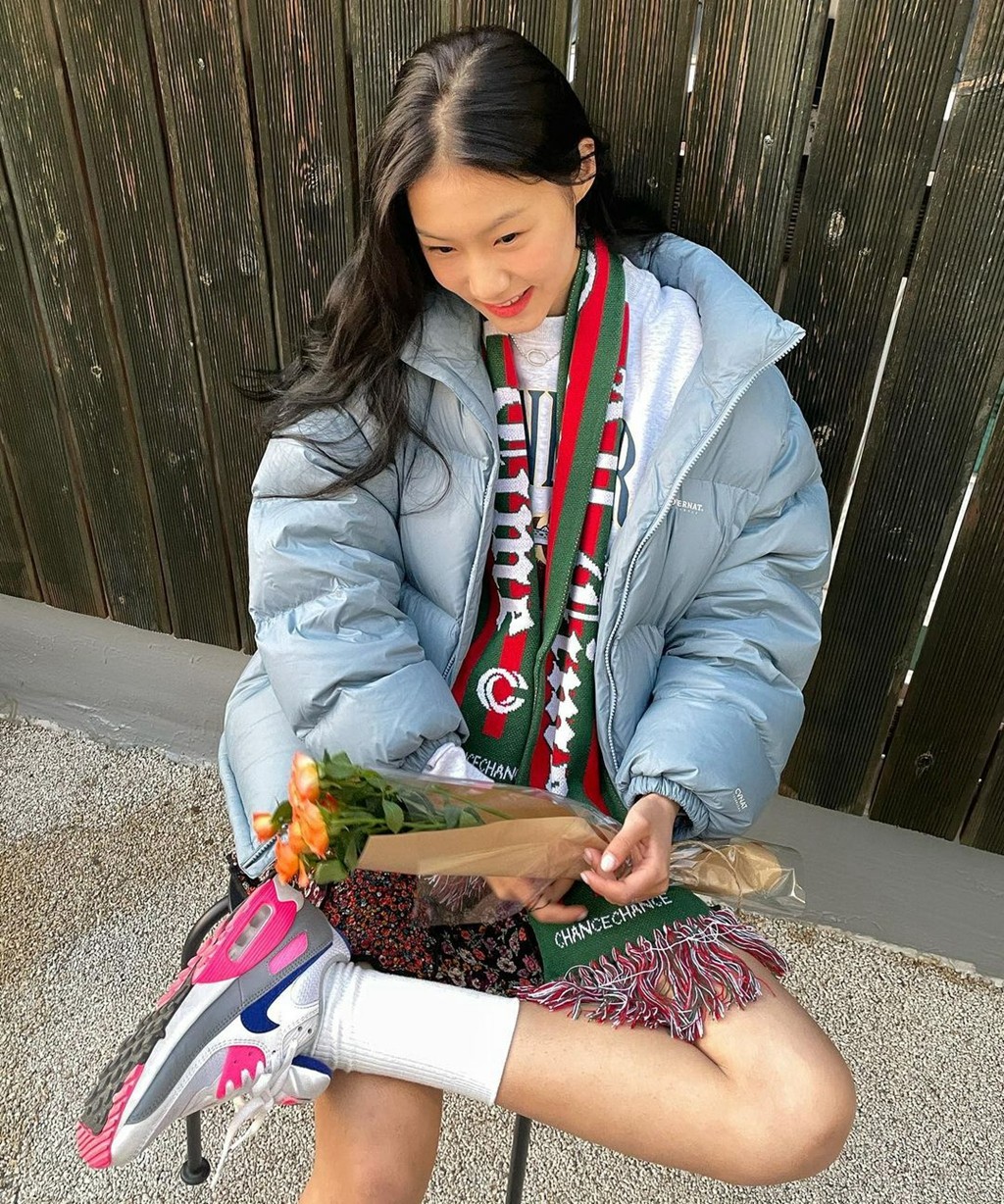 这双白粉 Air Max 90 算是女生中上脚率很好的鞋子了,只不过这羽绒服配短裤,她到底是冷还是不冷?