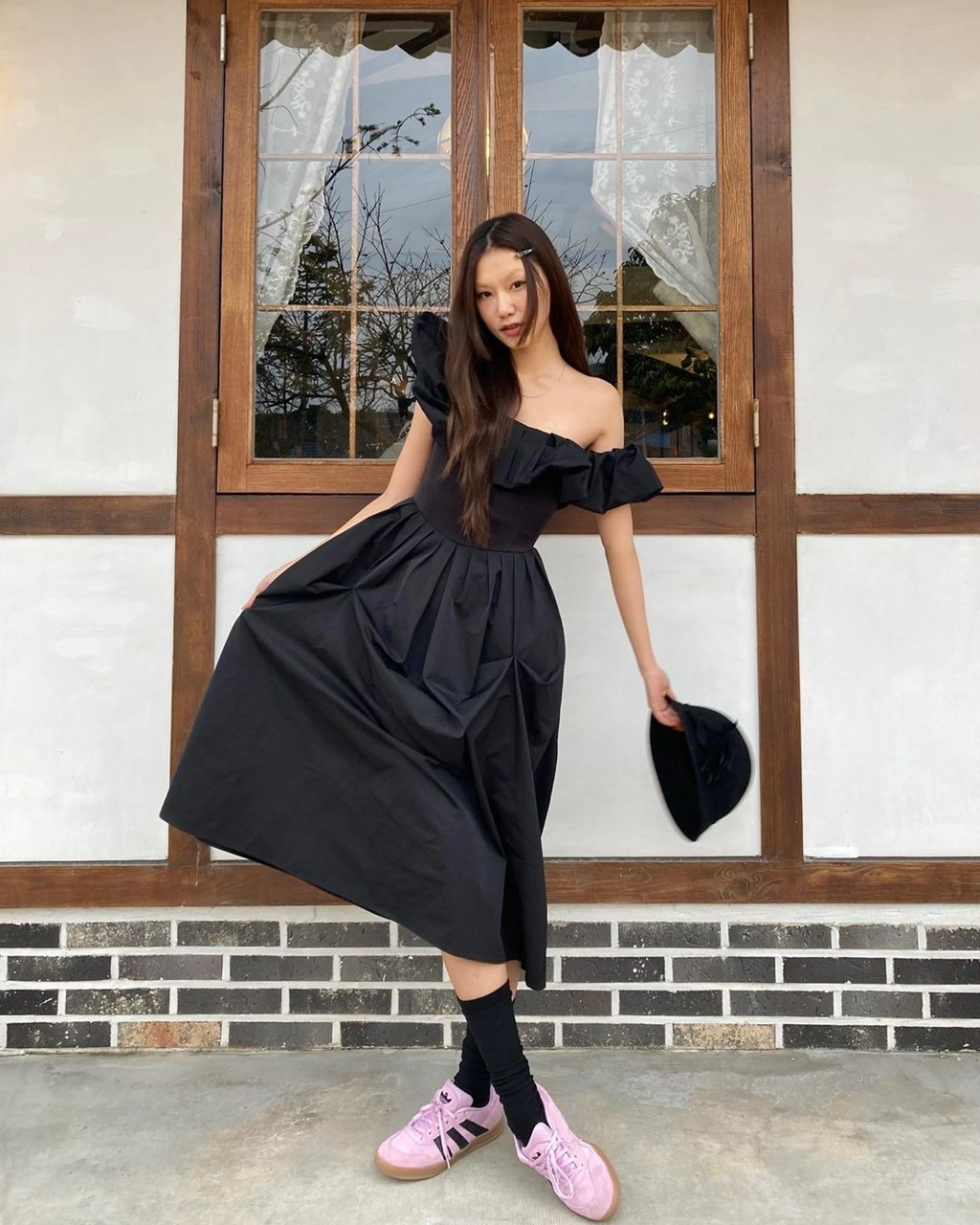 一袭黑色长裙居然搭配的是 adidas Aloha Super Mark Gona 小粉鞋,突出一个反差感,不经意间透露出可爱气质。