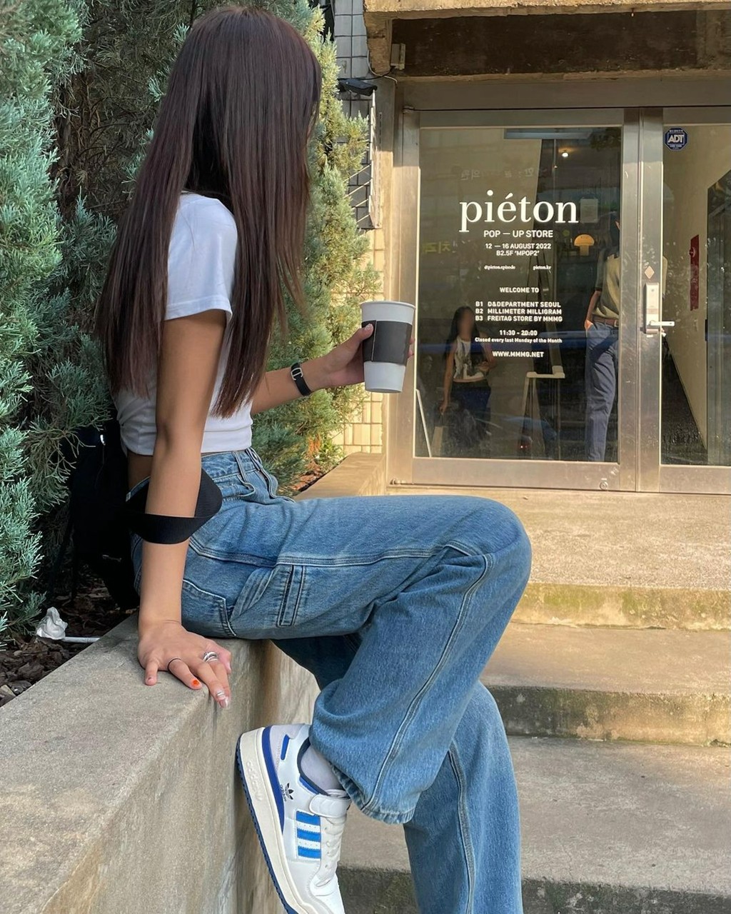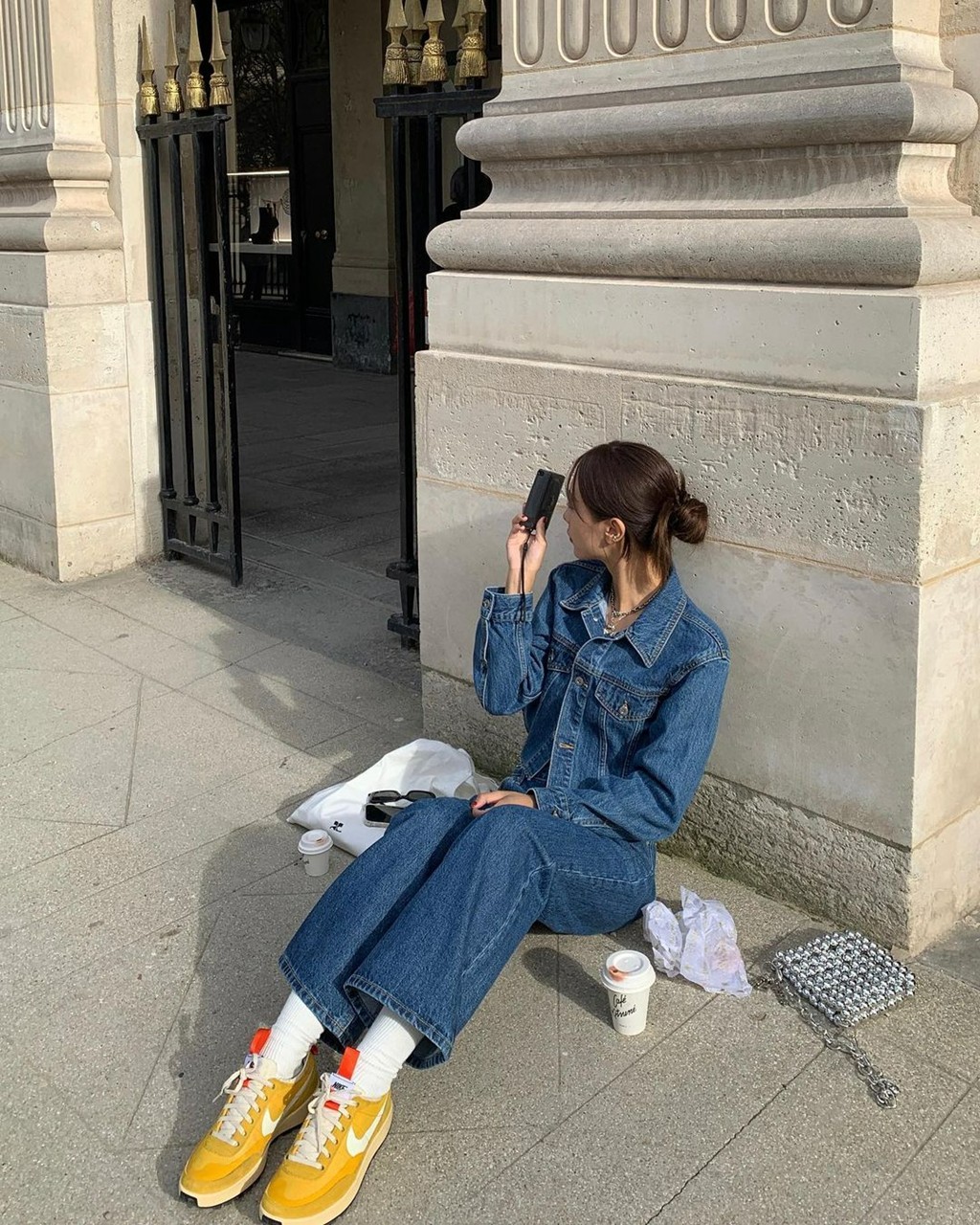 有时候甚至直接席地而坐,丝毫没有 “名媛” 的架子,一身单宁套装搭配「火星鞋」Tom Sachs x NikeCraft General Purpose Shoe。