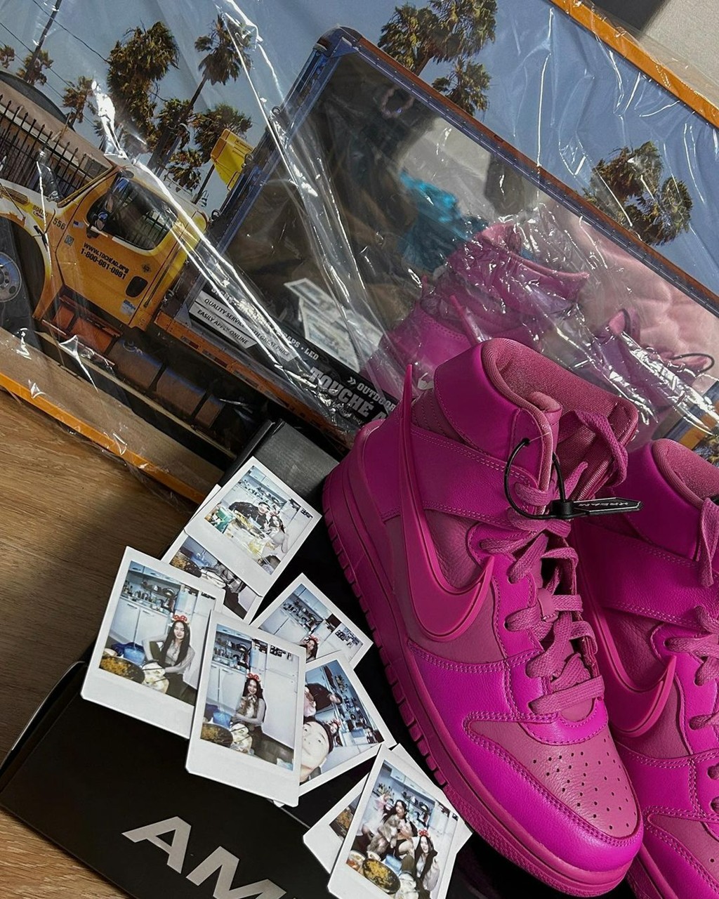 过生日时,Mlnhe 晒出自己心爱的生日礼物,正是一双粉色 AMBUSH x Nike Dunk Hi。