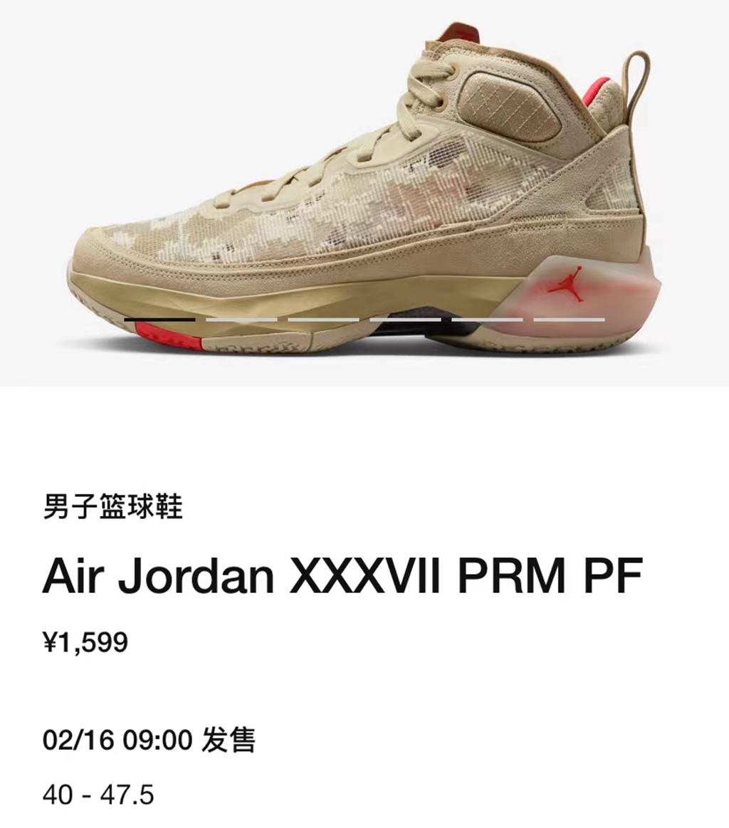 目前,Air Jordan 37 Premium “Rattan” 现已正式上架国区 SNKRS,将在 2 月 16 日也就是明天的上午 9:00 正式发售,定价 ¥1599 元。