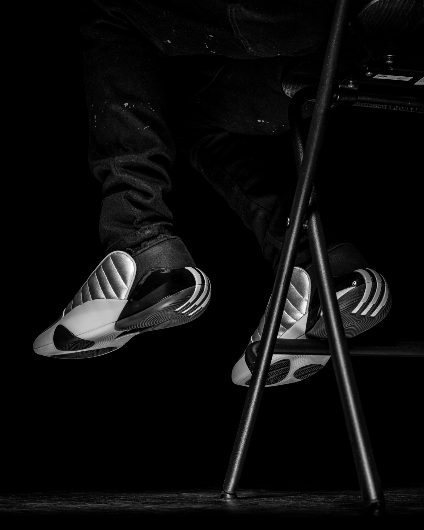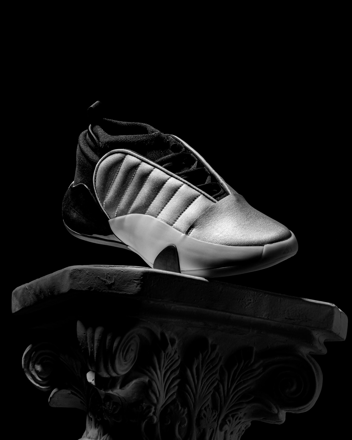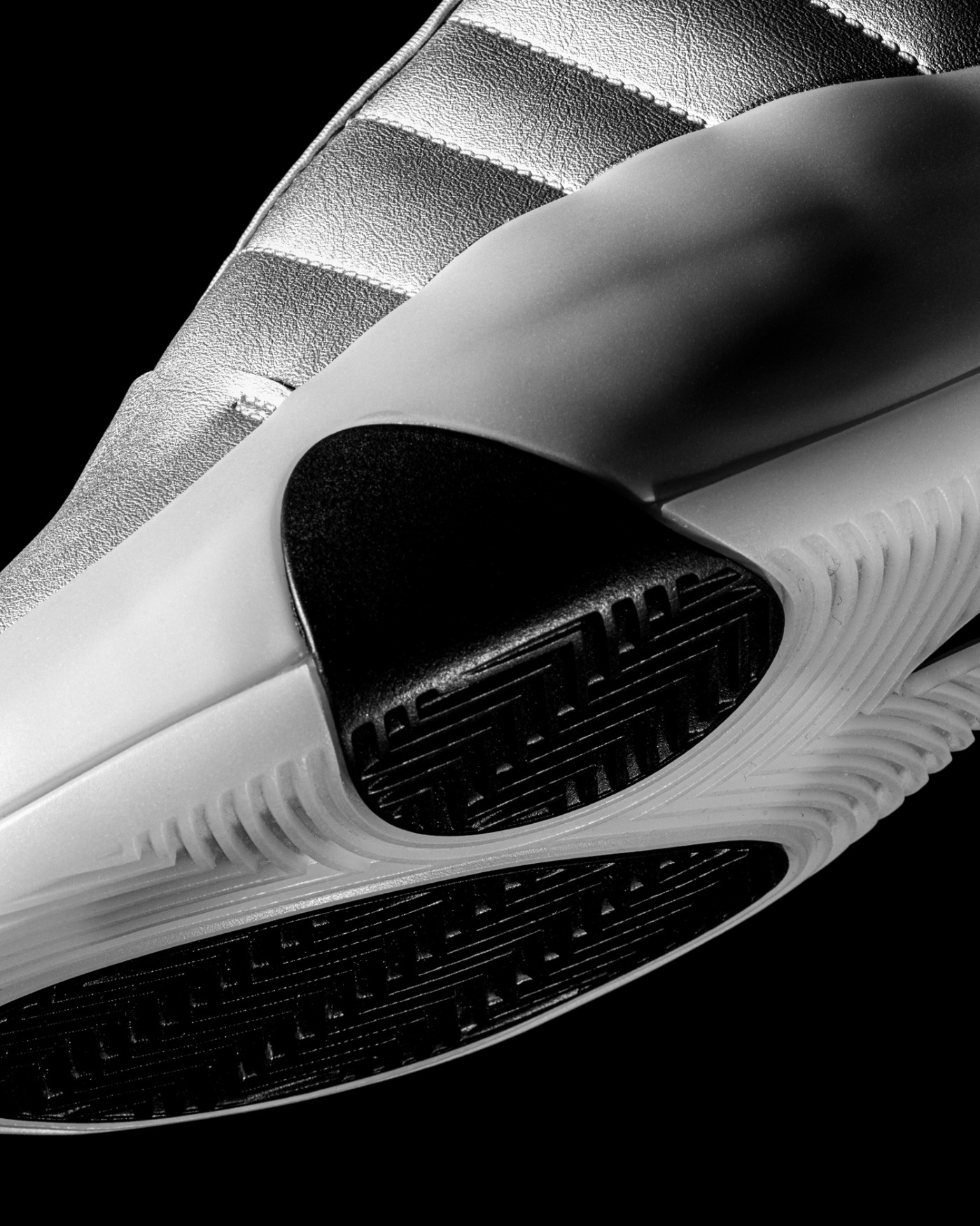 鞋身银色磨砂皮革柔软细腻,灵感源自哈登喜爱的蓬松夹克外套,巧妙融入经典的三线元素。