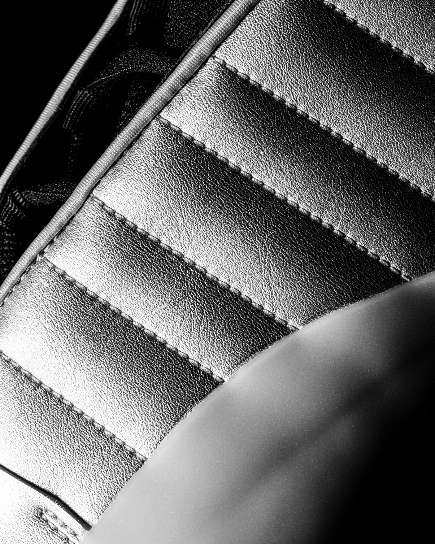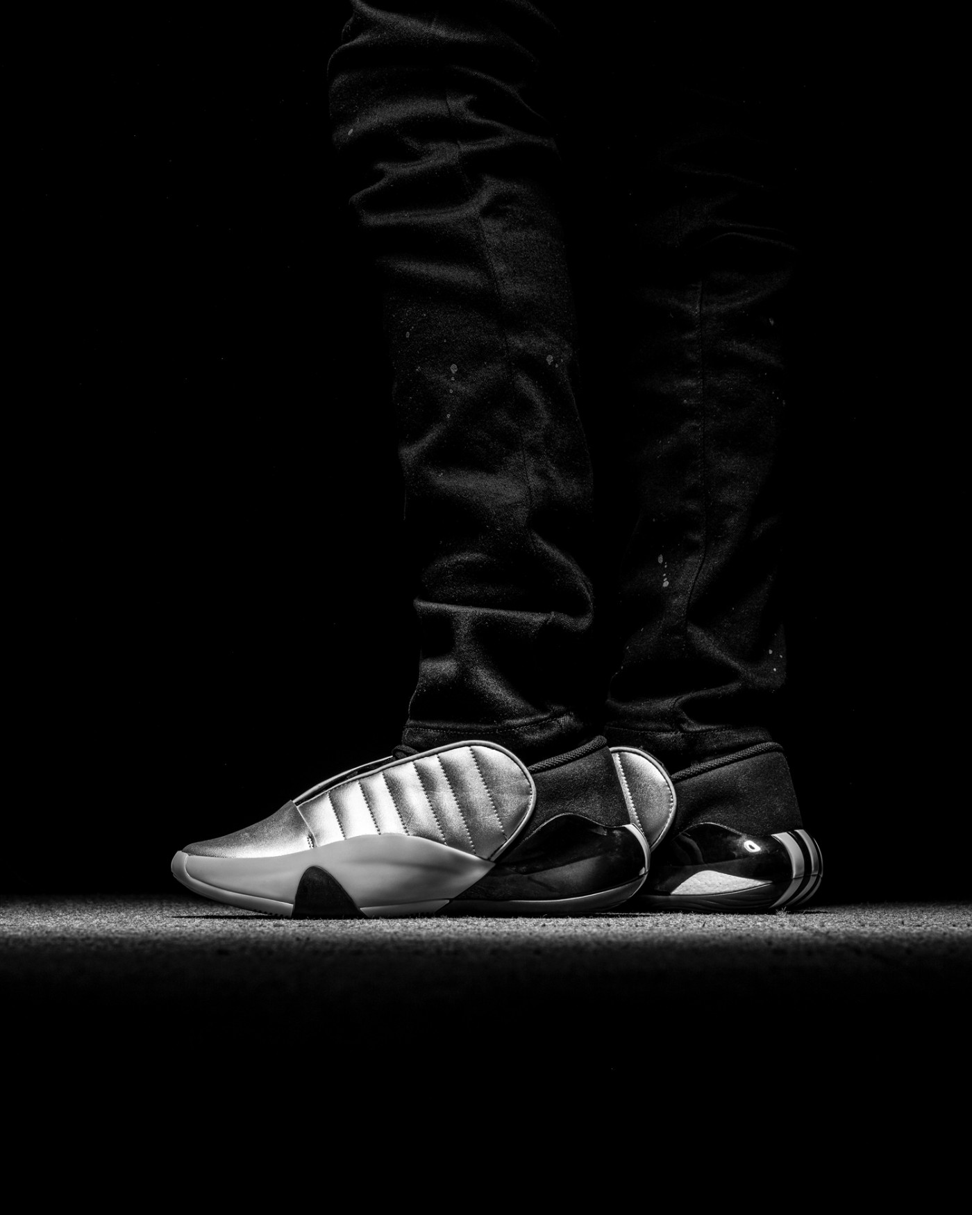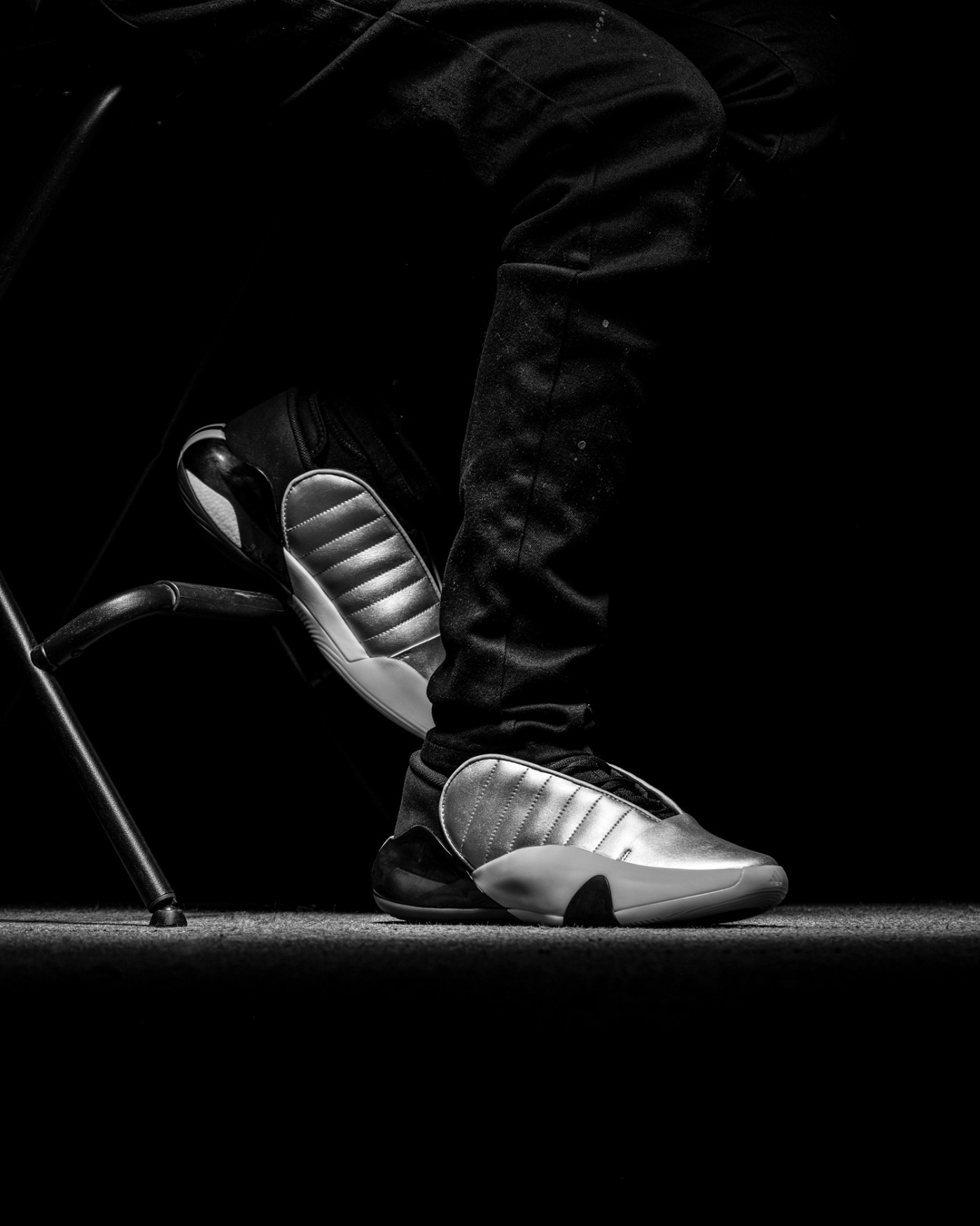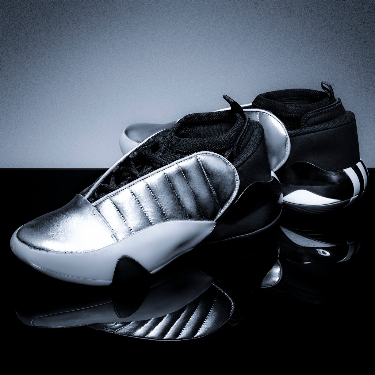 鞋身银色磨砂皮革柔软细腻,灵感源自哈登喜爱的蓬松夹克外套,巧妙融入经典的三线元素。