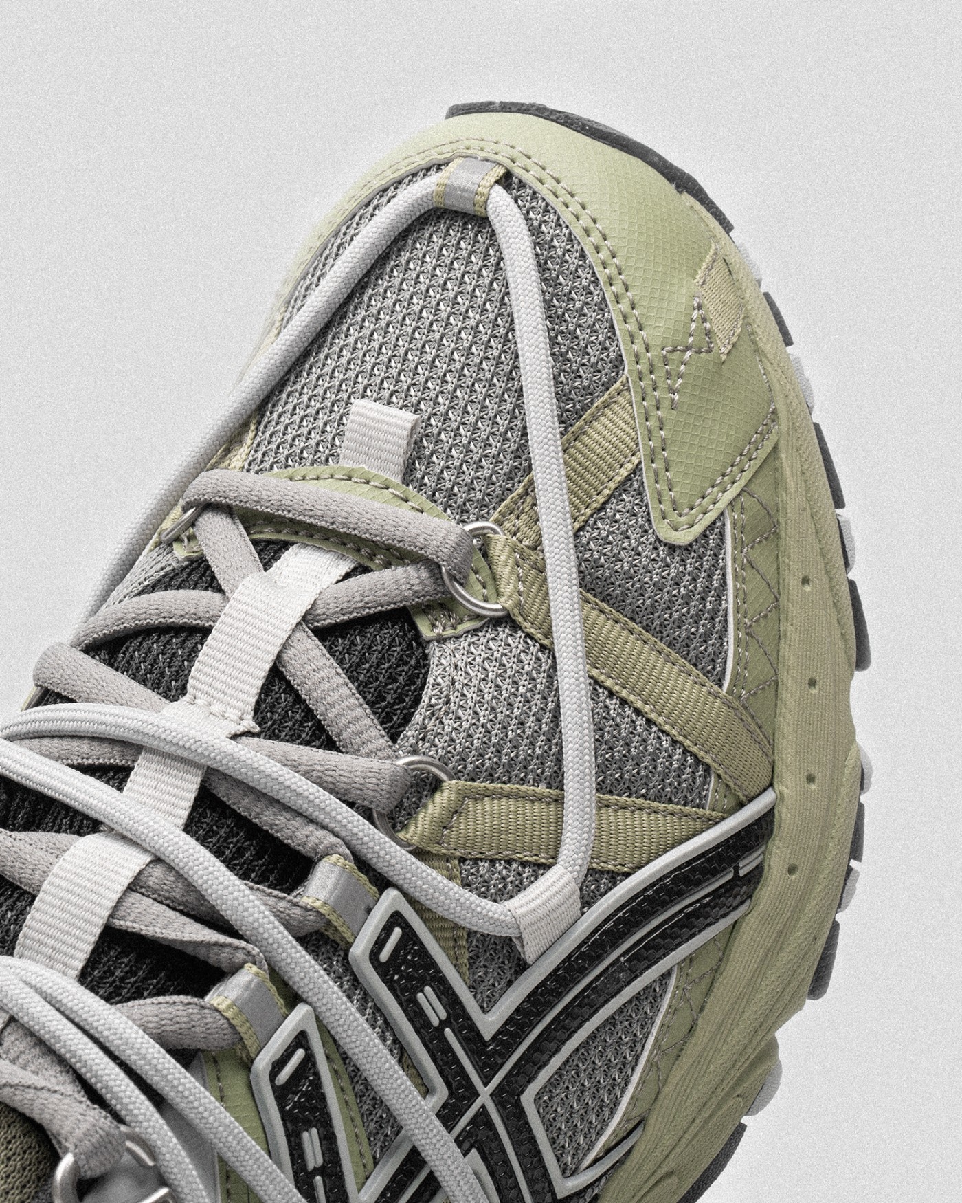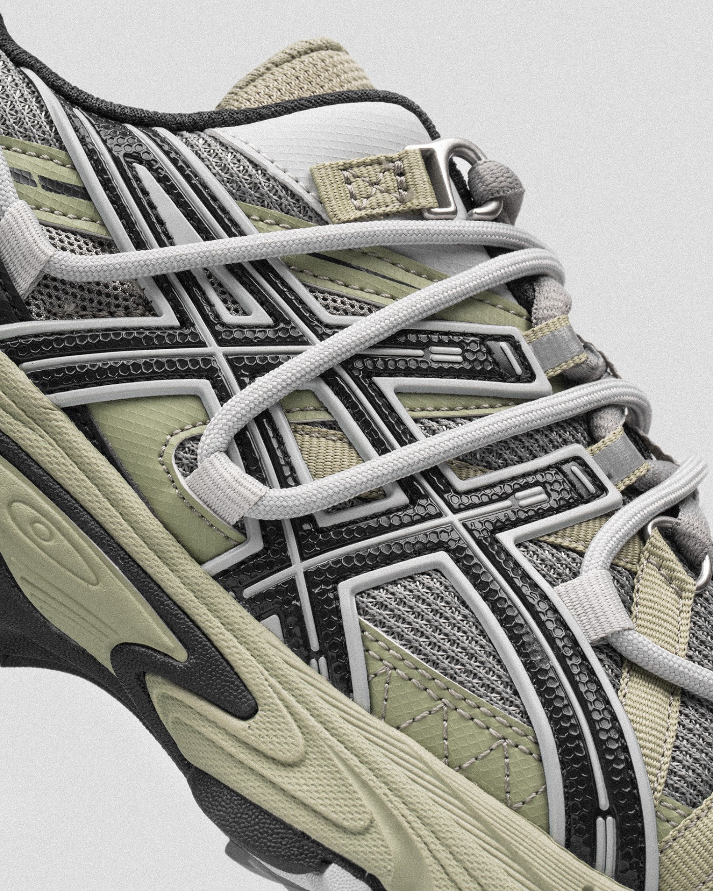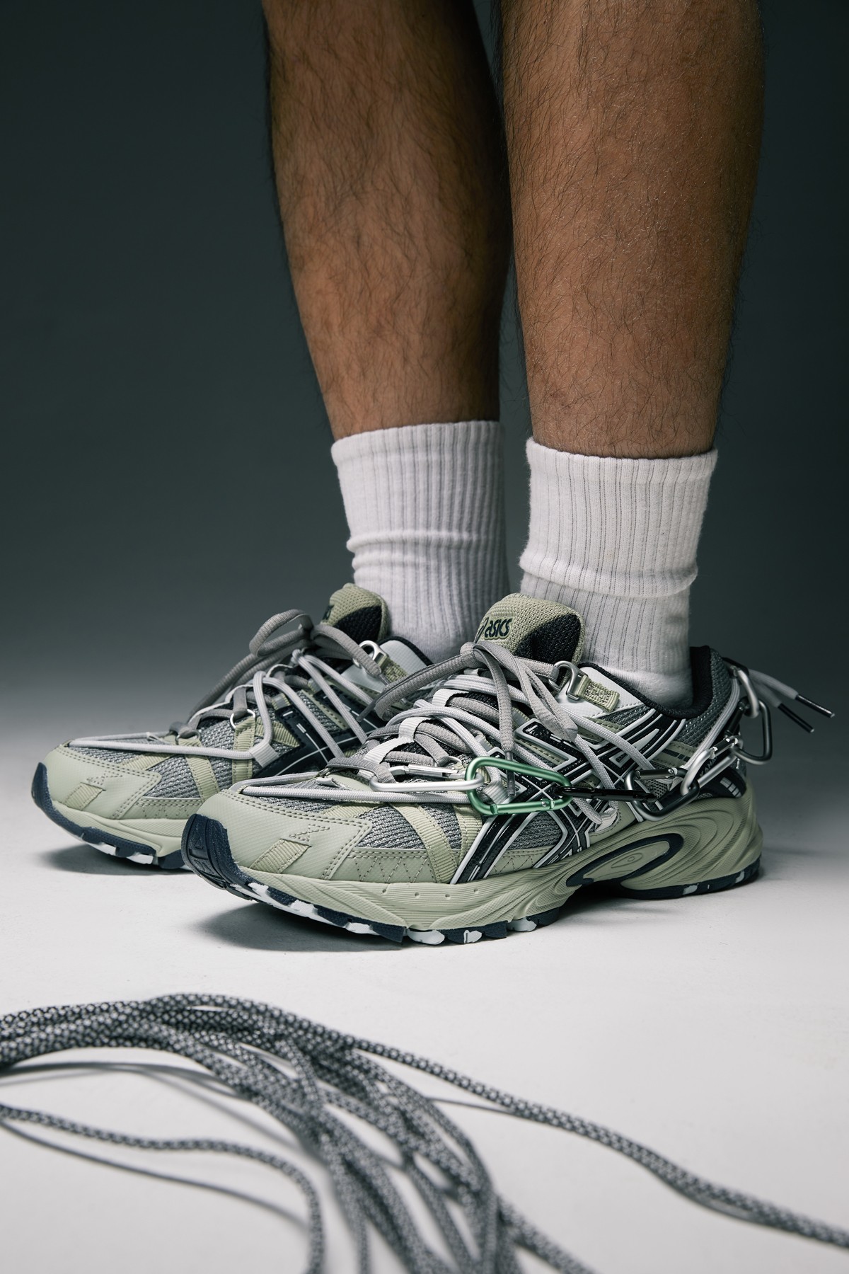 鞋身上的绳索细节非常值得一提,其设计灵感是来自于户外背包的穿绳方式,再结合日本传统草履绳结样式,为整体造型增添了户外机能感。