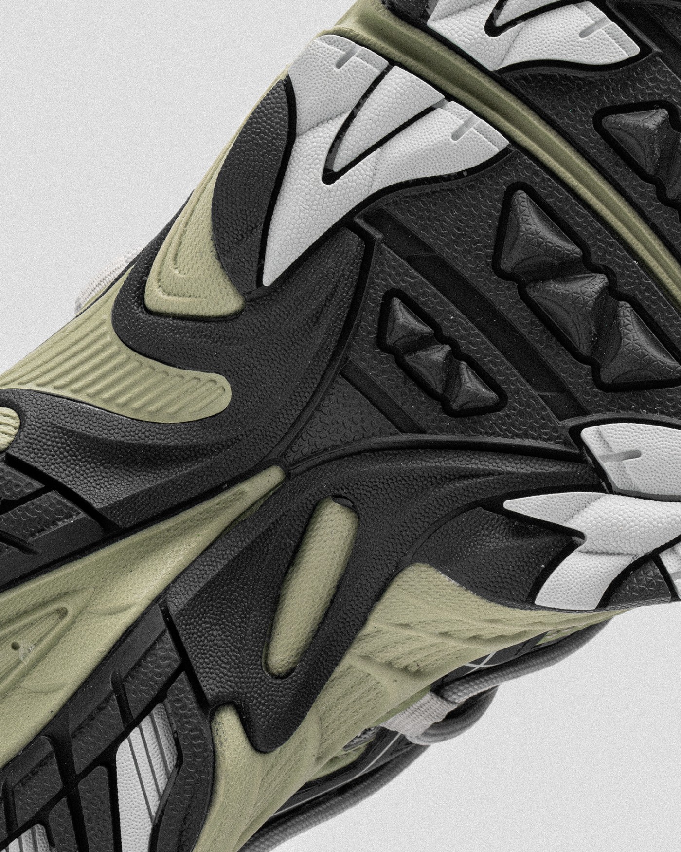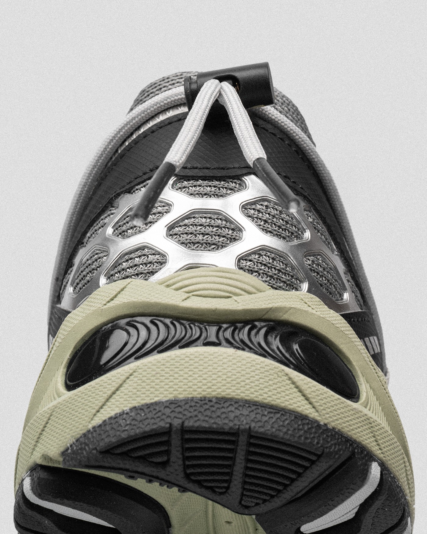 整双鞋采用银灰色为主调打造,辅以黑色和饱和度不高的绿色点缀,营造出复古造型的同时,还带有几分 Y2K 气质。