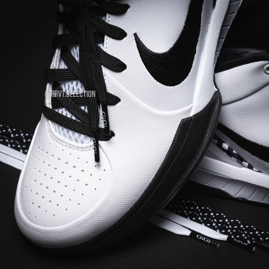 整双鞋以大面积白色为主调,辅以黑色妆点,致敬科比曼巴篮球学院的球衣配色。