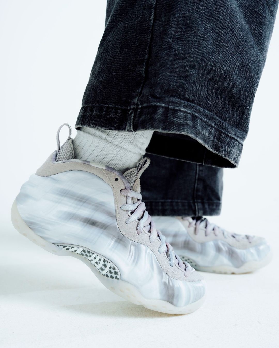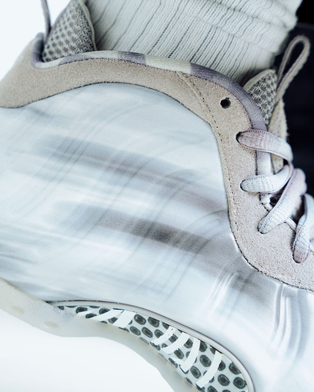 整双鞋采用大面积白色为主调,辅以青灰色晕影,使鞋身呈现出仿佛彗星划过一般,所以曝光后也被不少玩家称之为「彗星喷」。