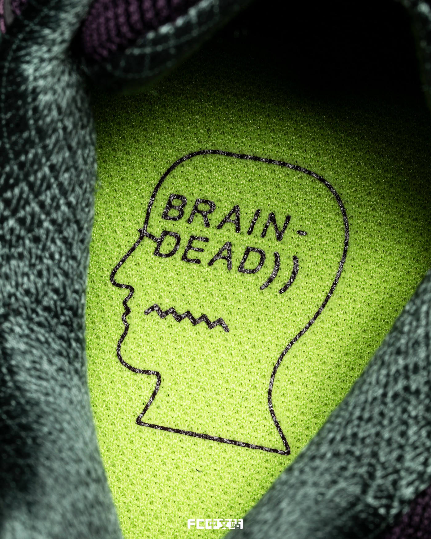 鞋垫部分,BRAIN DEAD 的 LOGO 直接呈现在亮绿色中,延续一贯的夺目彰显,标明鞋款身份。