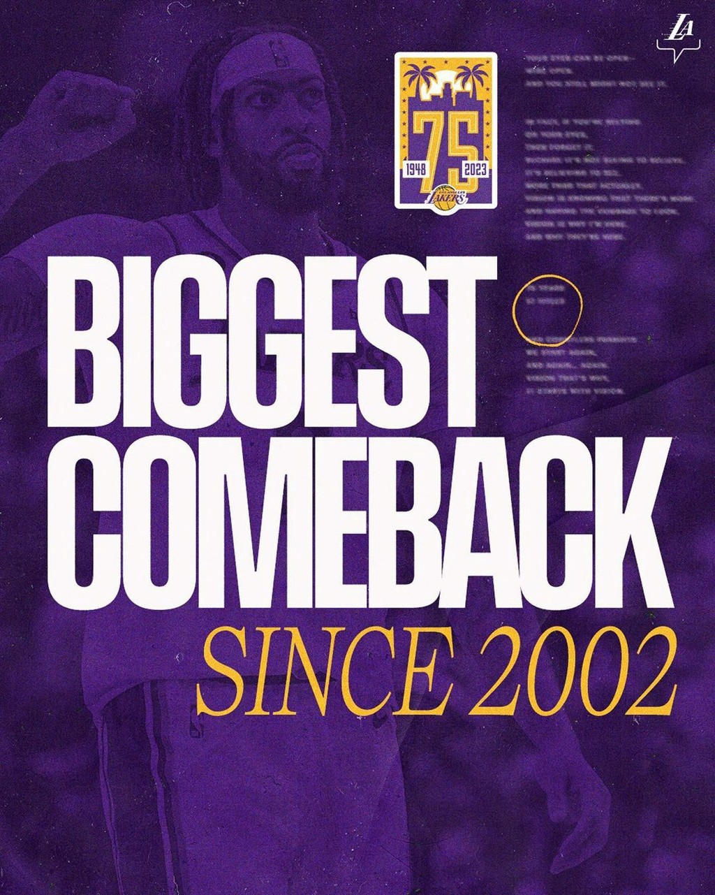 湖人在最多落后独行侠 27 分的情况下,打出 2020 年冠军赛季的韧性,实现了队史 2002 年至今的最大逆转!