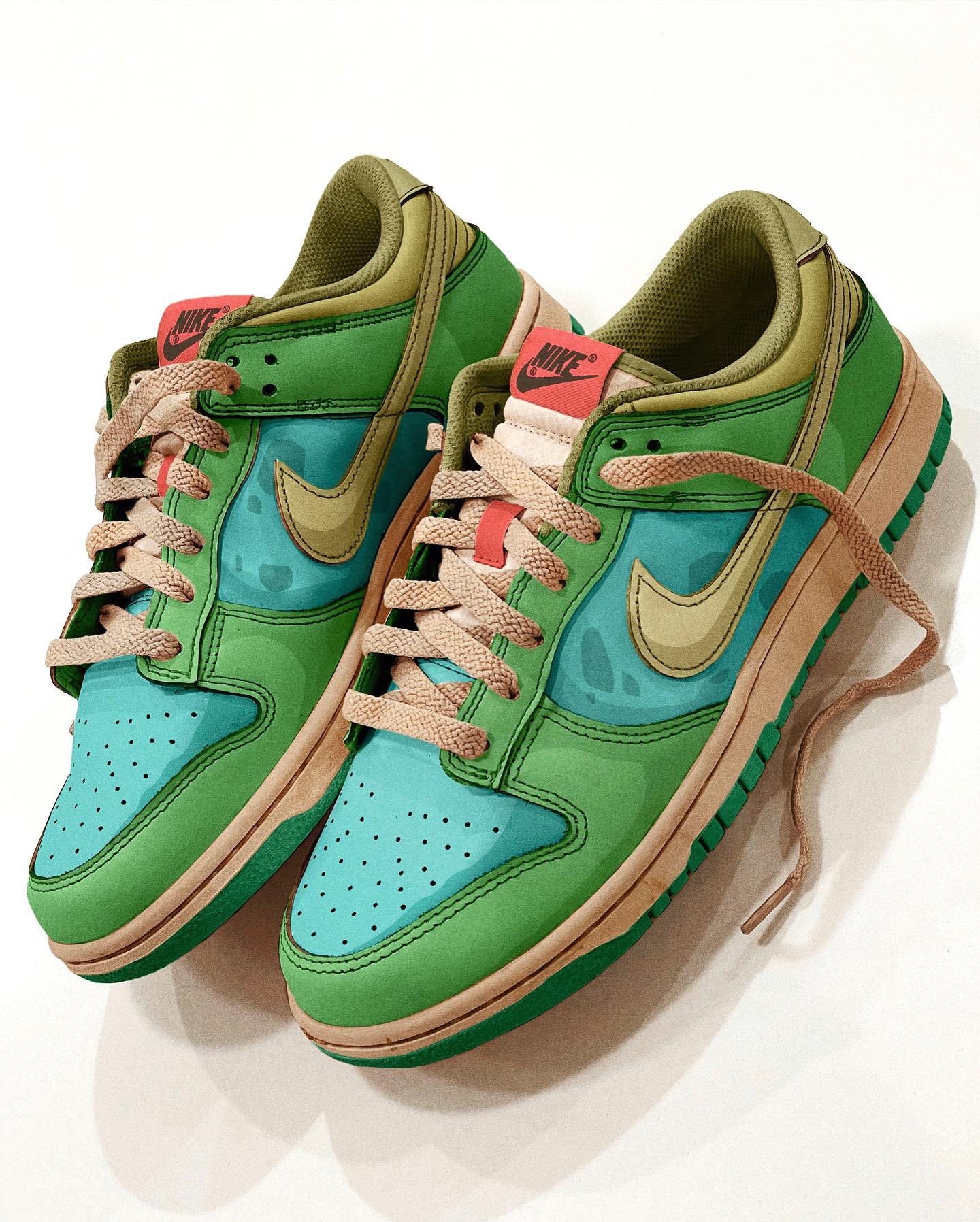第四款选用超高人气的妙蛙种子为灵感,以 Nike Dunk Low 为蓝本设计。