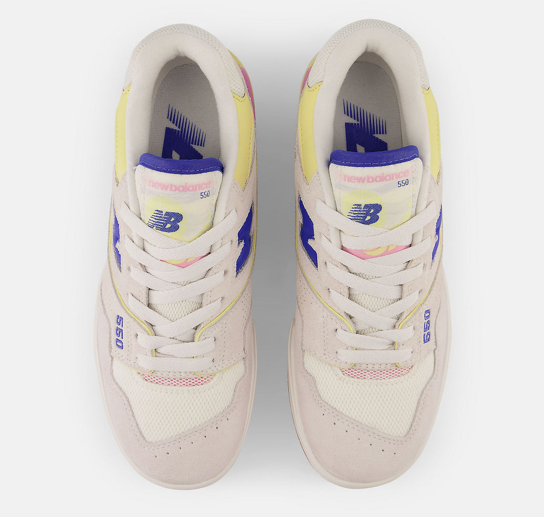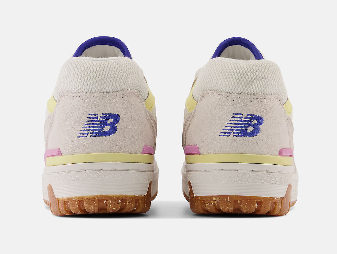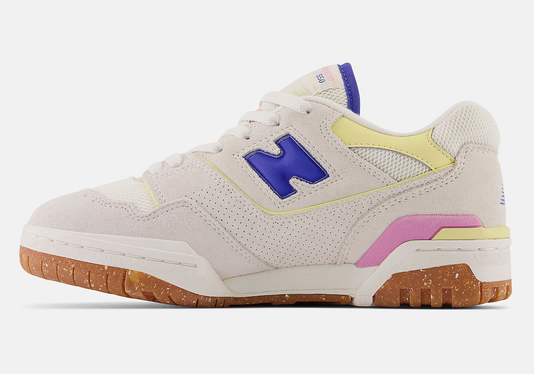 整双鞋采用米白色为主调,辅以电光紫、黄色和粉色点缀,造型简约又不失亮眼细节。