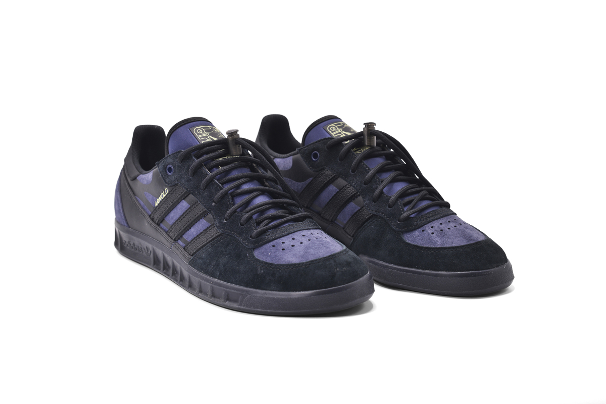 此次联名以 Handball Top 这一经典鞋型为蓝本进行创作,通体采用黑色和蓝紫色打造,造型格外科幻酷炫。