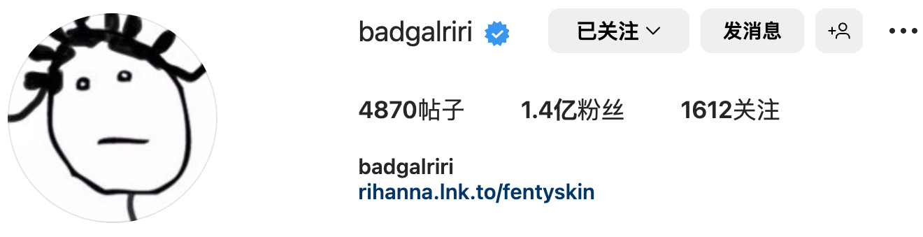 蕾哈娜个人社交媒体(@badgalriri)坐拥 1.4 亿粉丝,即便沉寂多年,随时回归依旧是全球顶流。