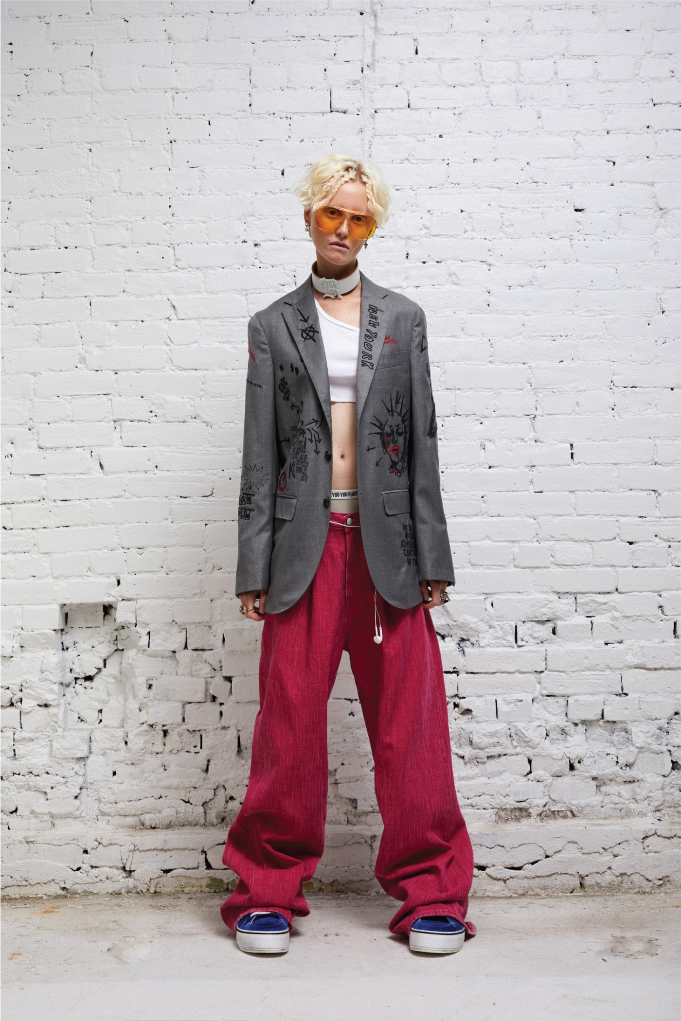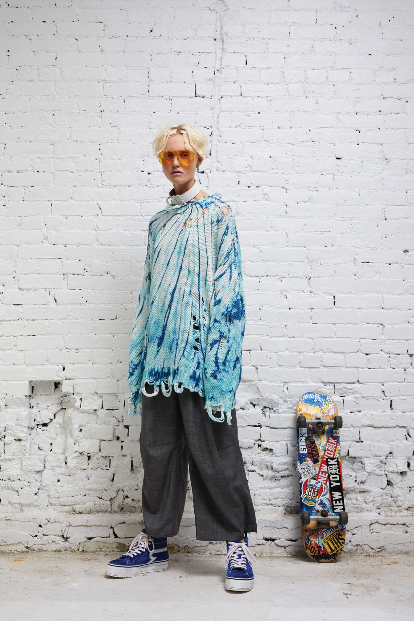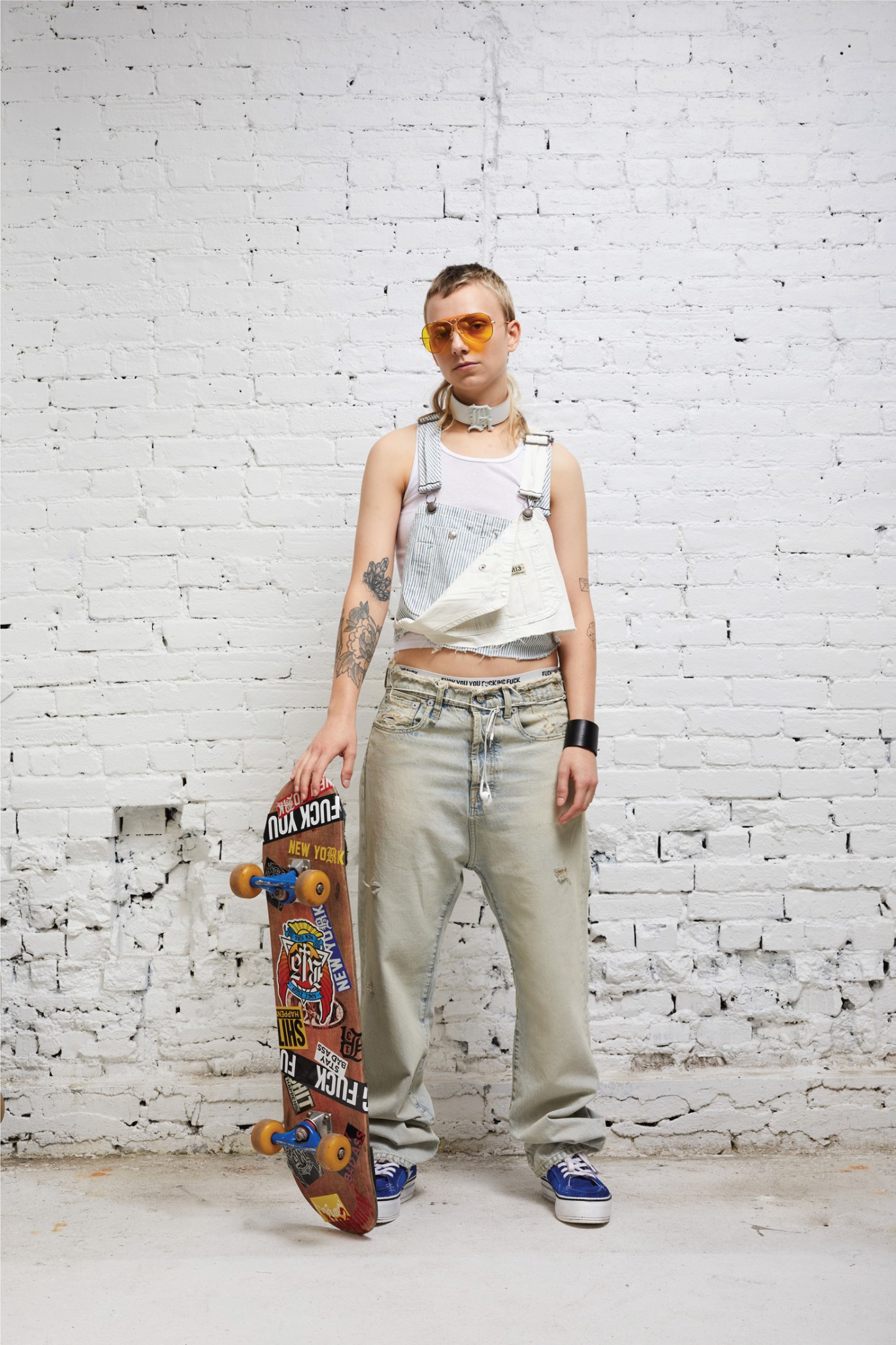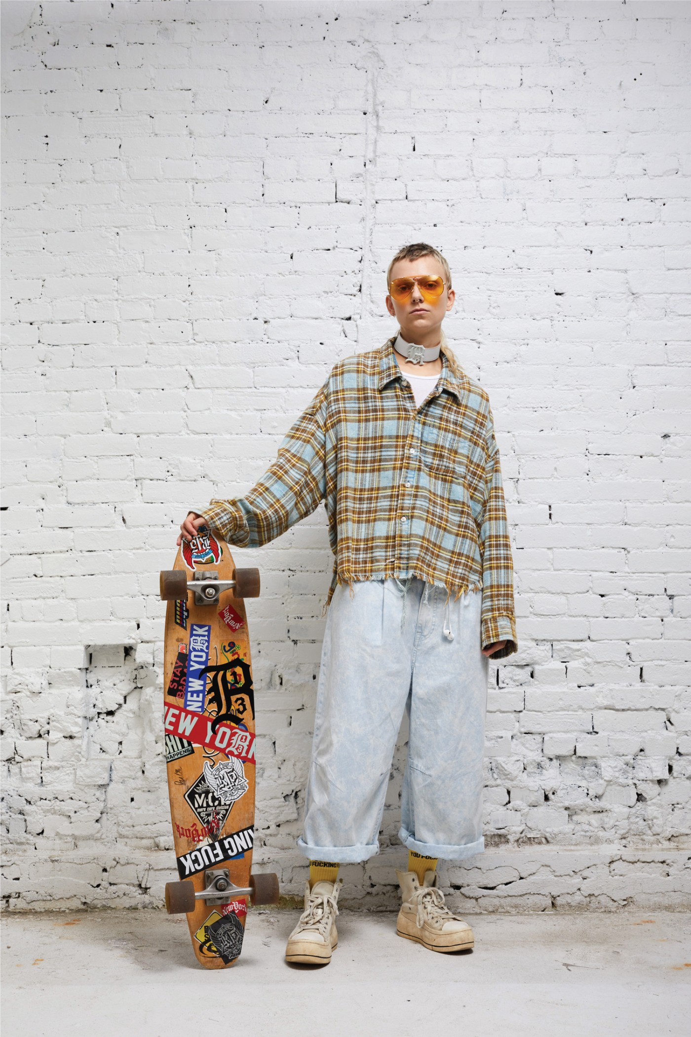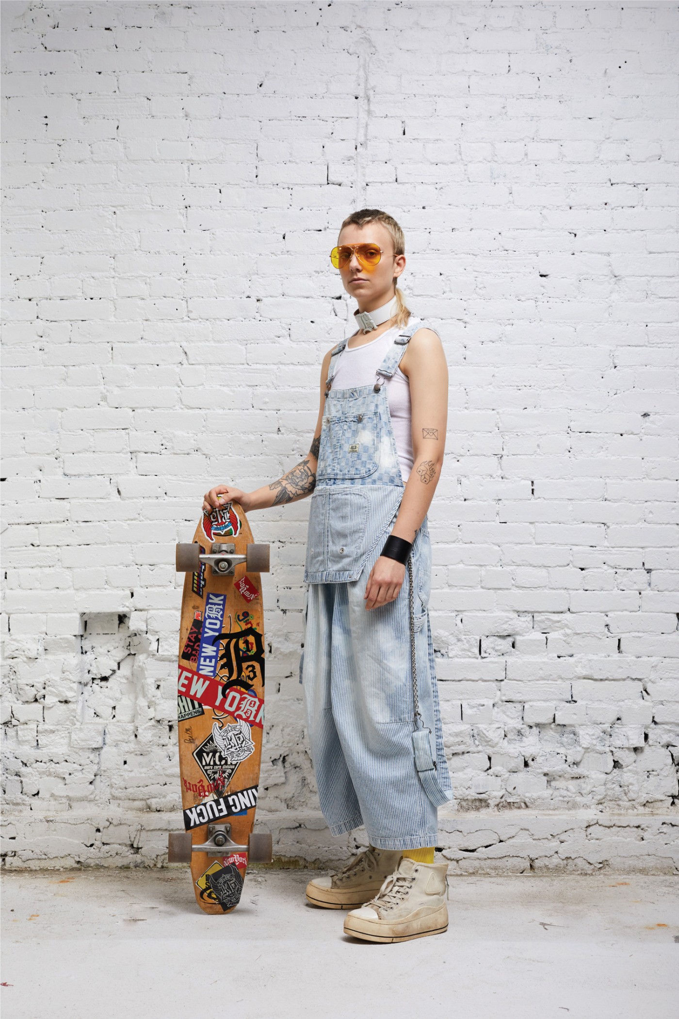 以及装饰着彩色贴纸的复古滑板为设计灵感,复古滑板上的五彩贴纸配色中和了冷色调的水洗牛仔,热带羊毛西装可休闲可正式,严肃中又带有俏皮,剪裁既有 Oversize 衬衫、落裆的松垮牛仔裤,也有剪裁修身的 Tank 背心和背带裤。