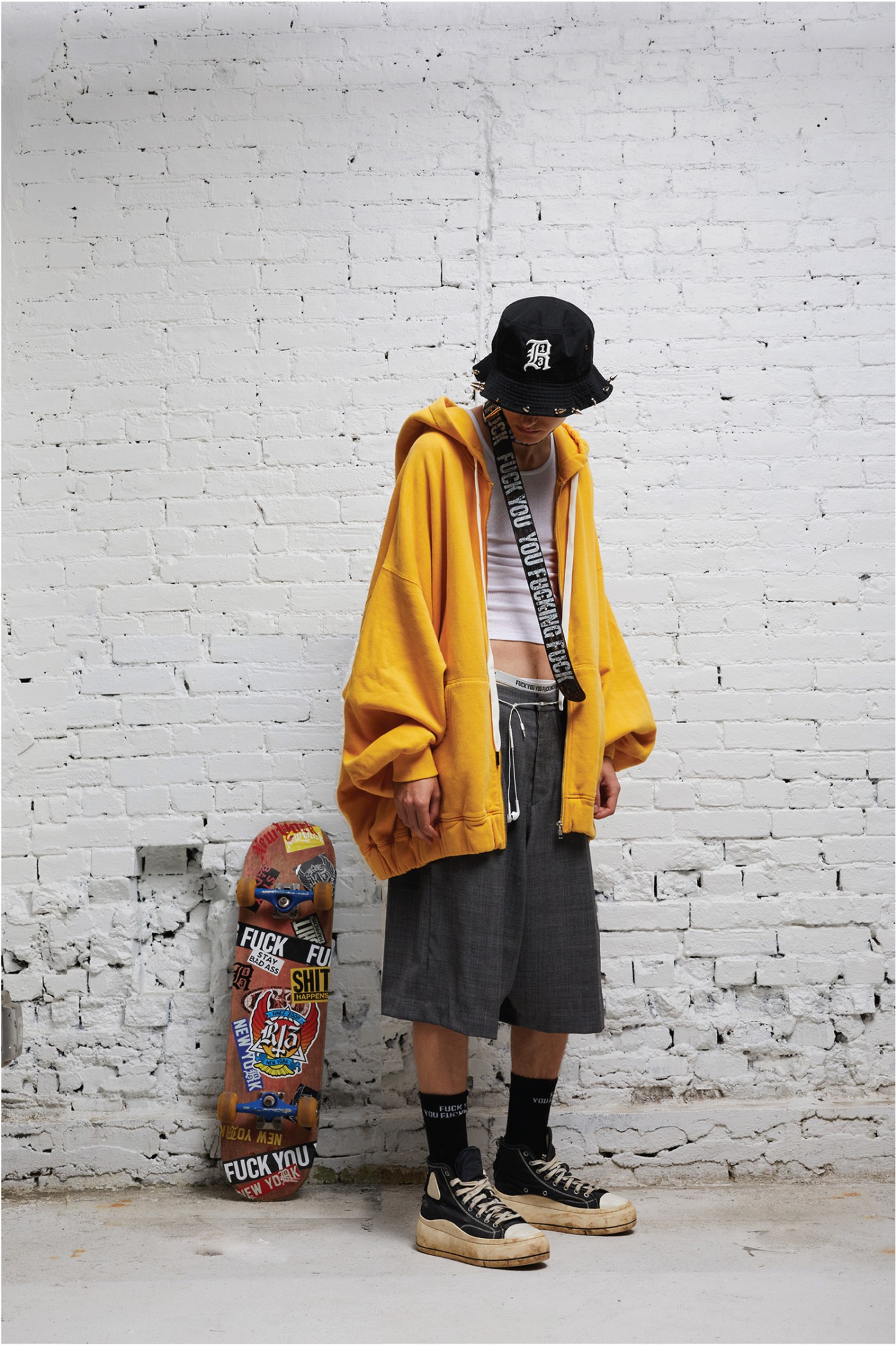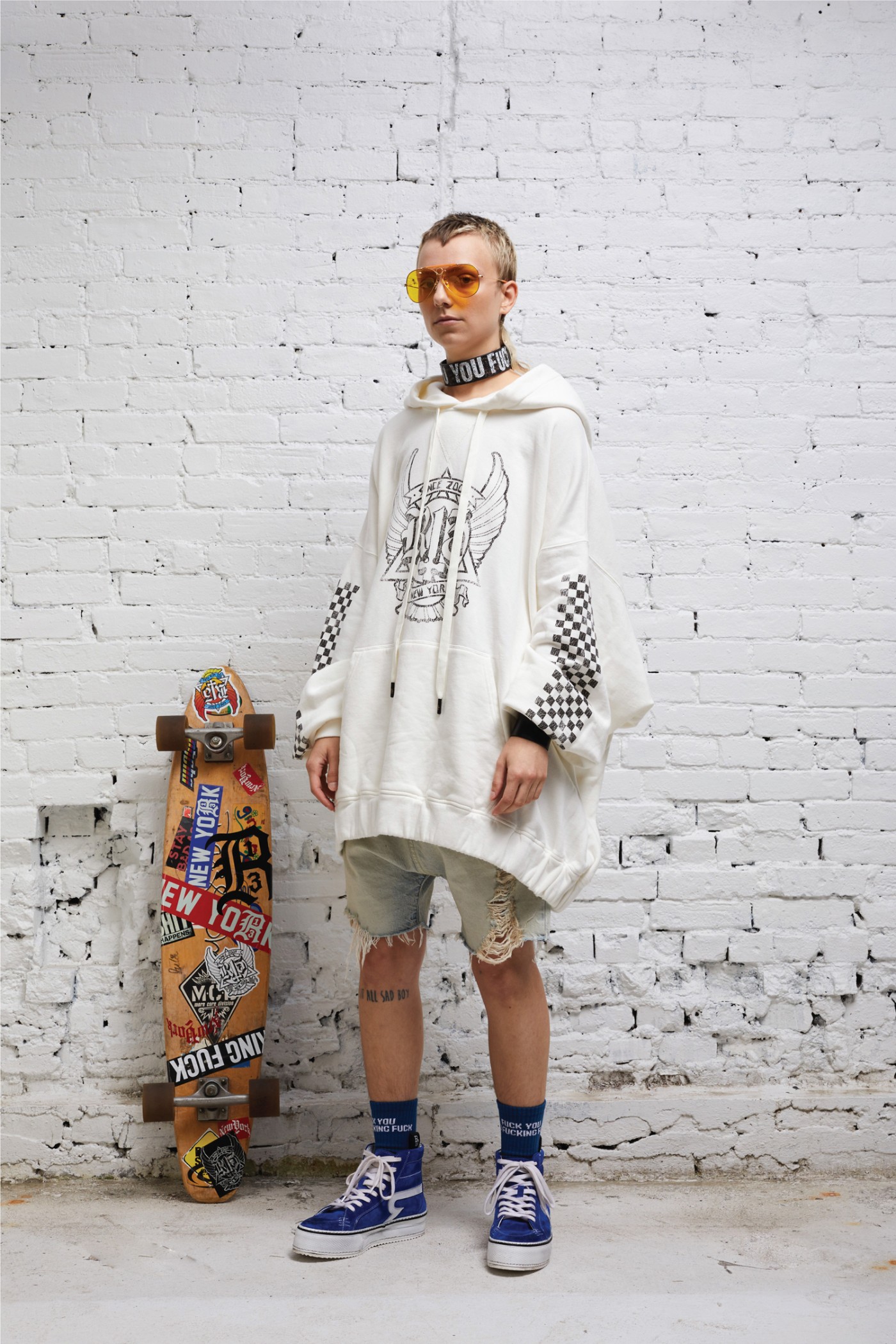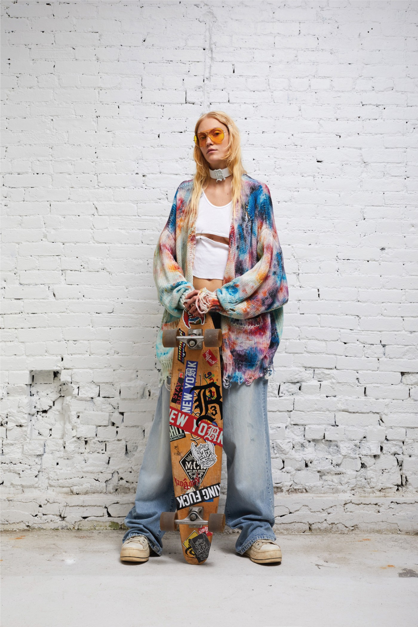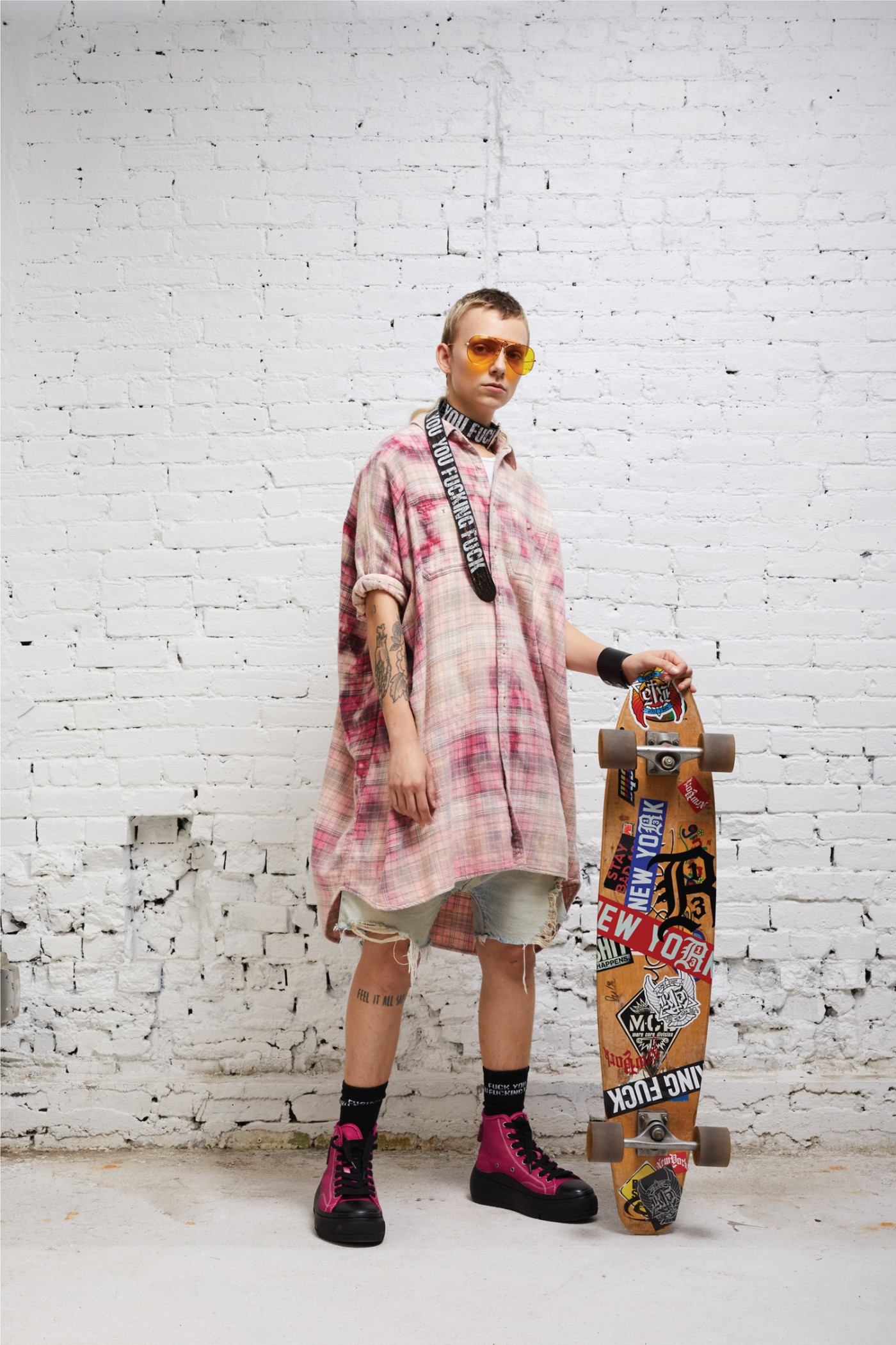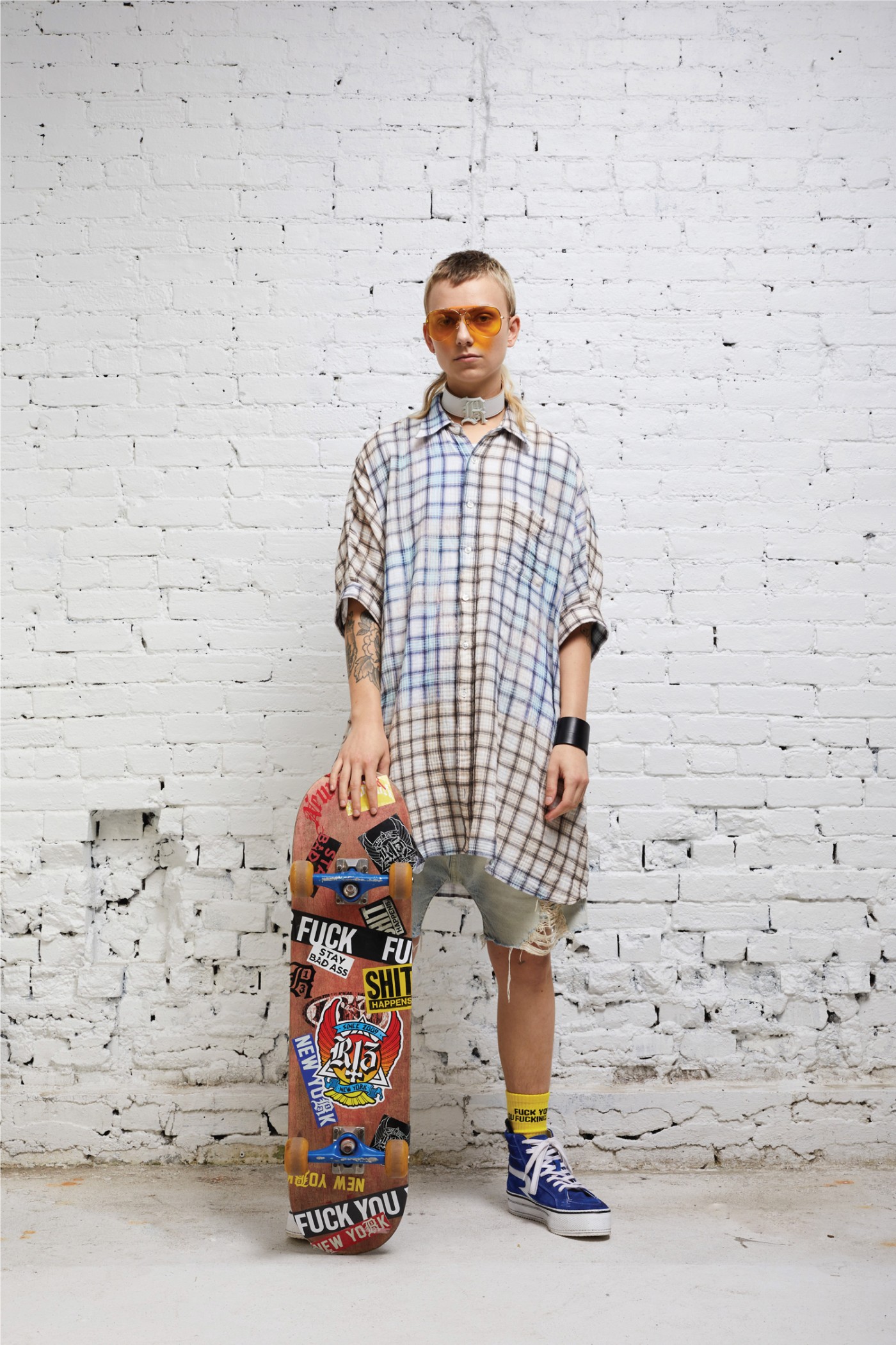 以及装饰着彩色贴纸的复古滑板为设计灵感,复古滑板上的五彩贴纸配色中和了冷色调的水洗牛仔,热带羊毛西装可休闲可正式,严肃中又带有俏皮,剪裁既有 Oversize 衬衫、落裆的松垮牛仔裤,也有剪裁修身的 Tank 背心和背带裤。