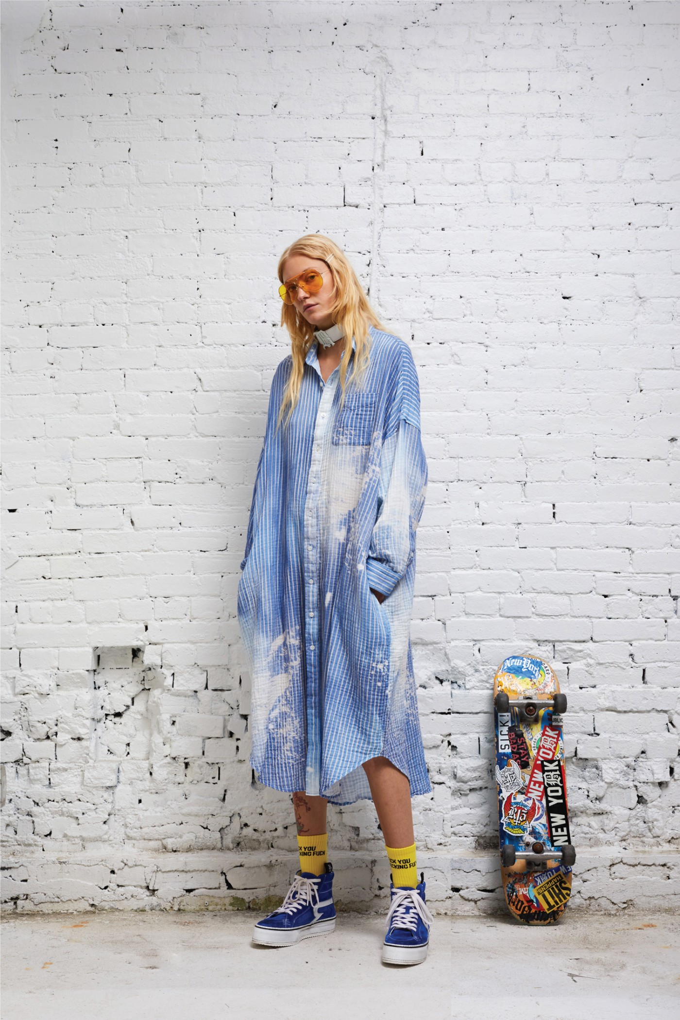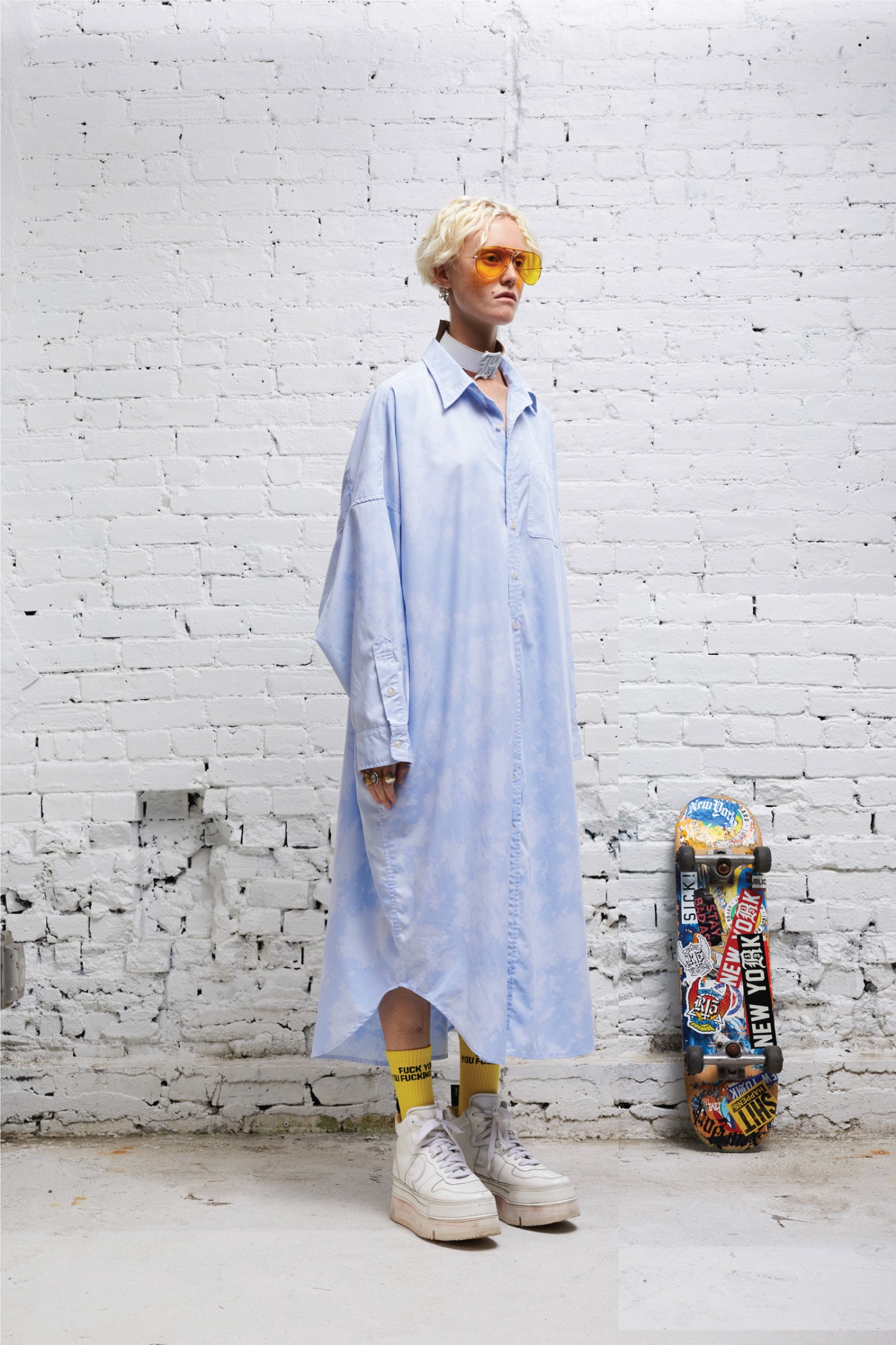 重新演绎经典褶皱纱衬衫,通过数字印刷实现漂白效果。