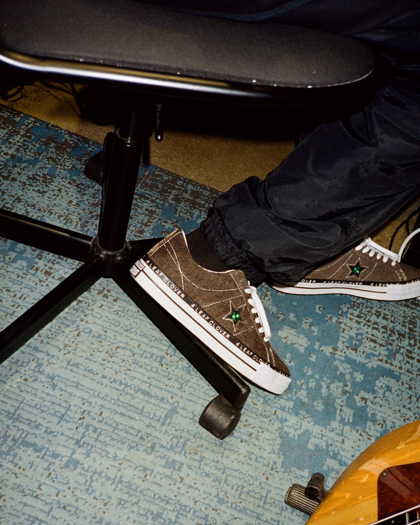 外侧的星星 Logo 加入四叶草元素,绕鞋身一圈的围条印有 4 Leaf Clover 字样,呼应联名系列主题。