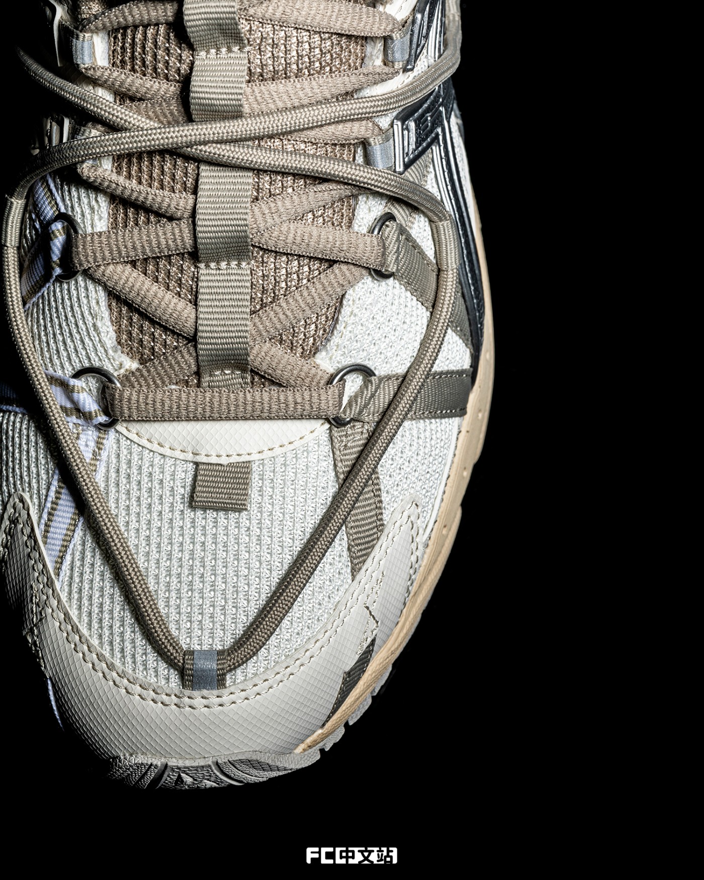 细节部分,虎爪纹 Logo 与鞋面布满的亚麻色尼龙带交错呈现,给人以乱中有序的机能感。