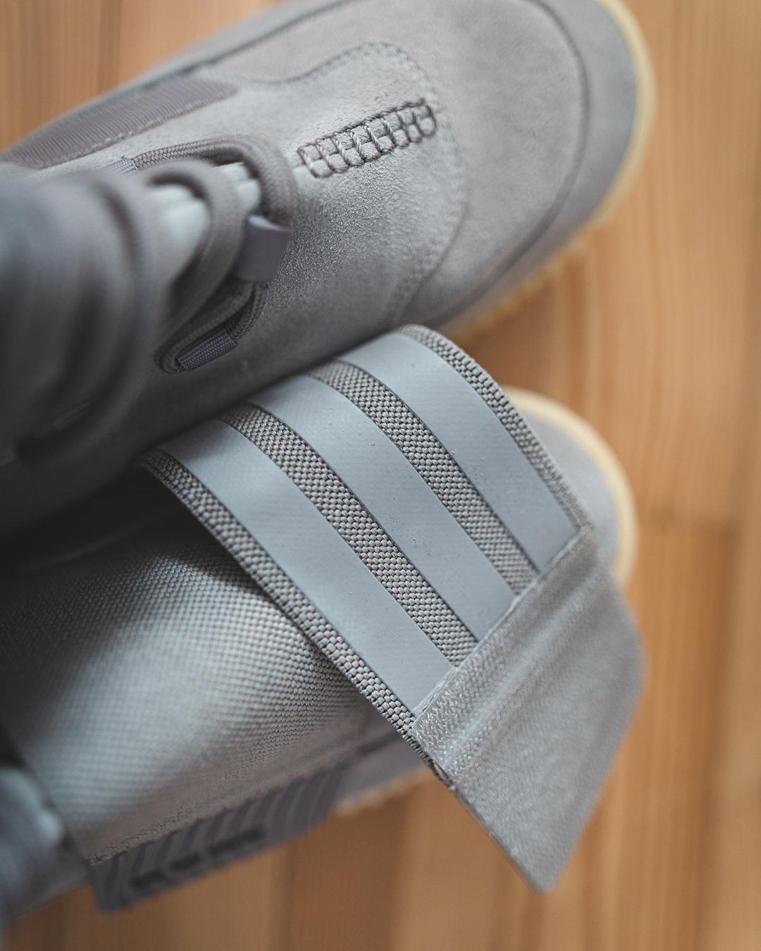 整双 Sample 的造型依旧是熟悉的超高帮设计,通体灰色的鞋身,加上带有略带泛黄的橡胶中底,整体造型与市售版本的首发配色异曲同工。