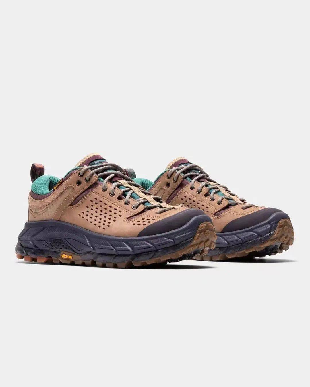 低帮版本为棕色调、高帮款为紫色装扮,搭载 GORE-TEX 科技和坚固耐用的 Vibram 外底,保证功能性。