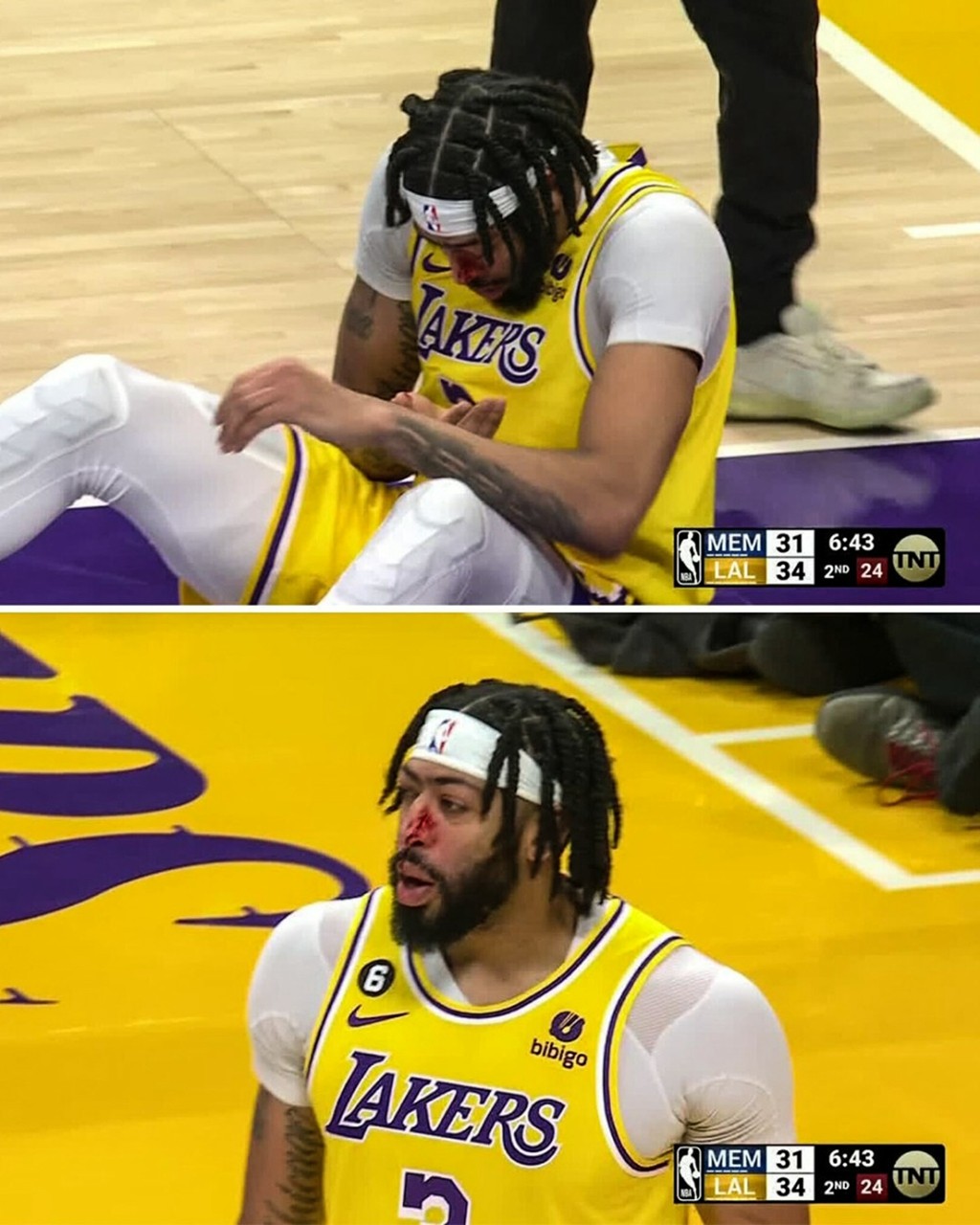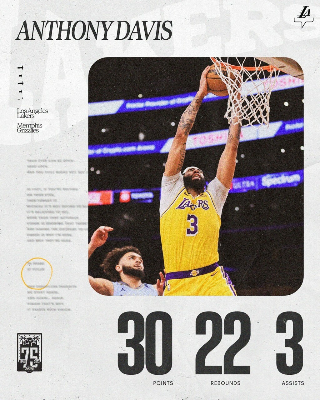 浓眉在鼻子受伤血流不止的情况下,坚持作战,砍下 30 分 22 篮板的恐怖数据,将胜利献给科比和加索尔。