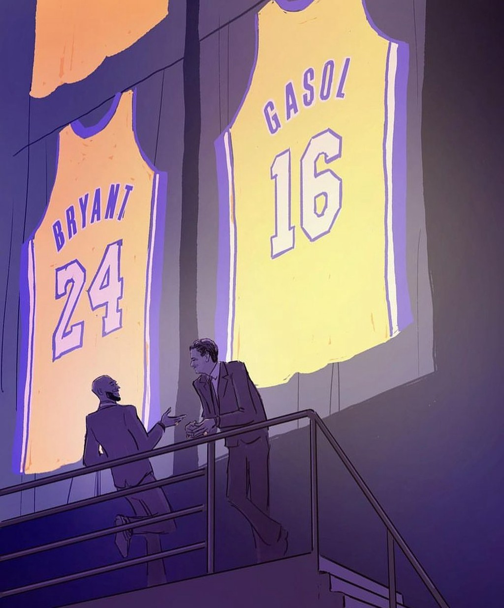 科比曾在 2018 年的奥斯卡颁奖现场时直言:“加索尔的 16 号球衣会退役的,并且就紧挨着我的球衣”