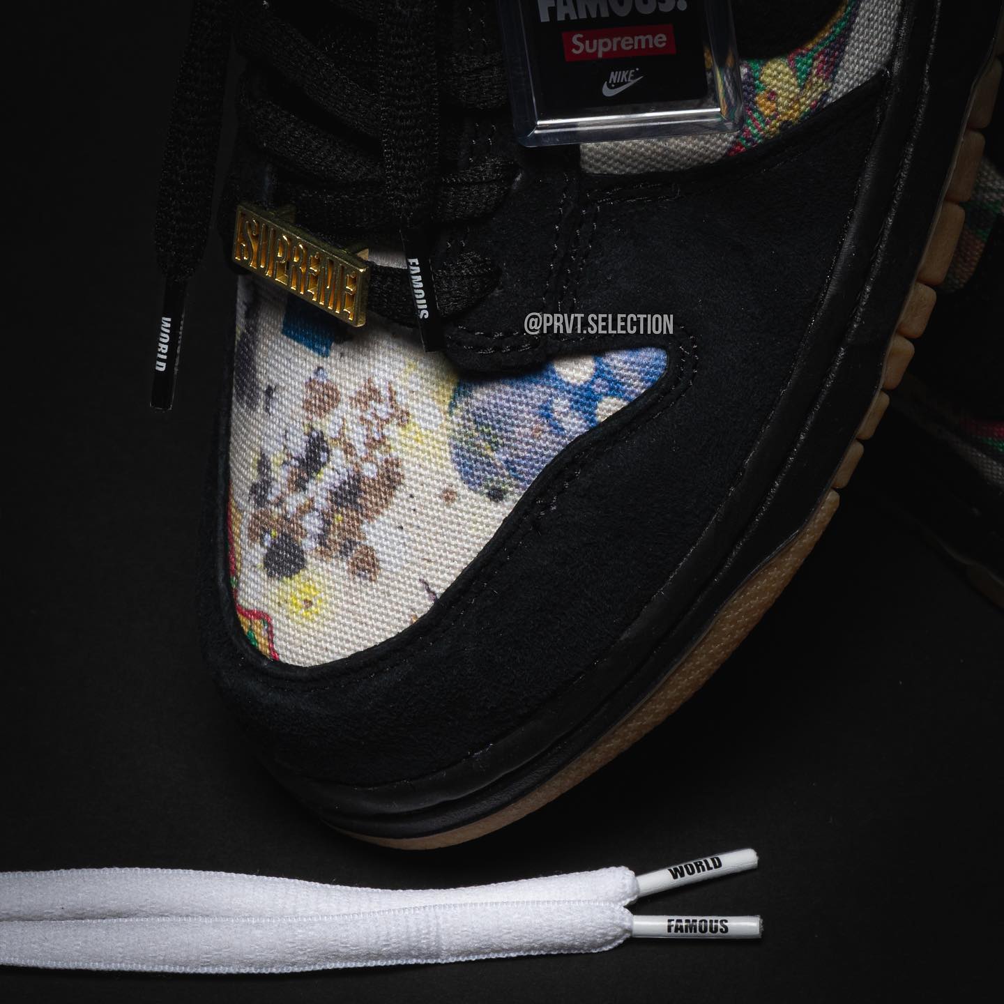 金色鞋标雕刻着 Supreme Logo、鞋带头印有 World Famous 字样,鞋垫也是采用了 Supreme 标志性的大红色,彰显鲜明的联名身份。