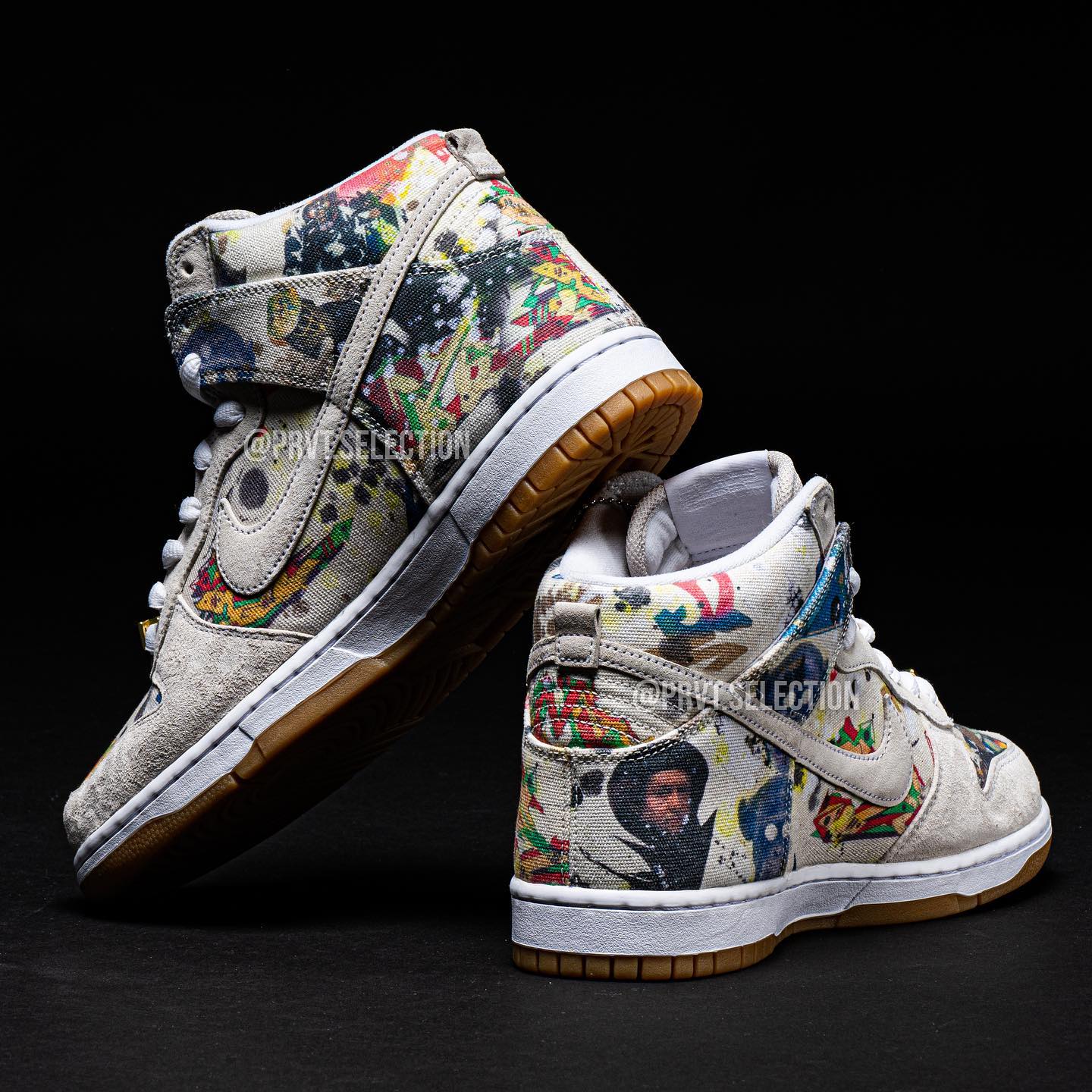 配色相比低帮版本,更大面积的鞋面换来的是更为高调的图案覆盖,除了涂鸦还包括了 Rammellzee 本人形象,艺术装置等。