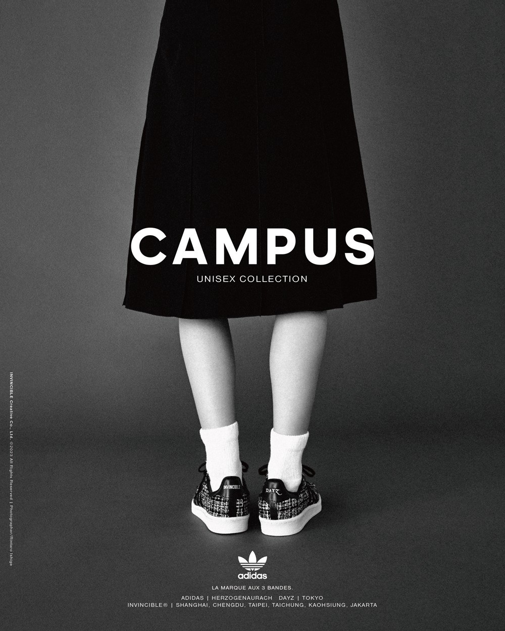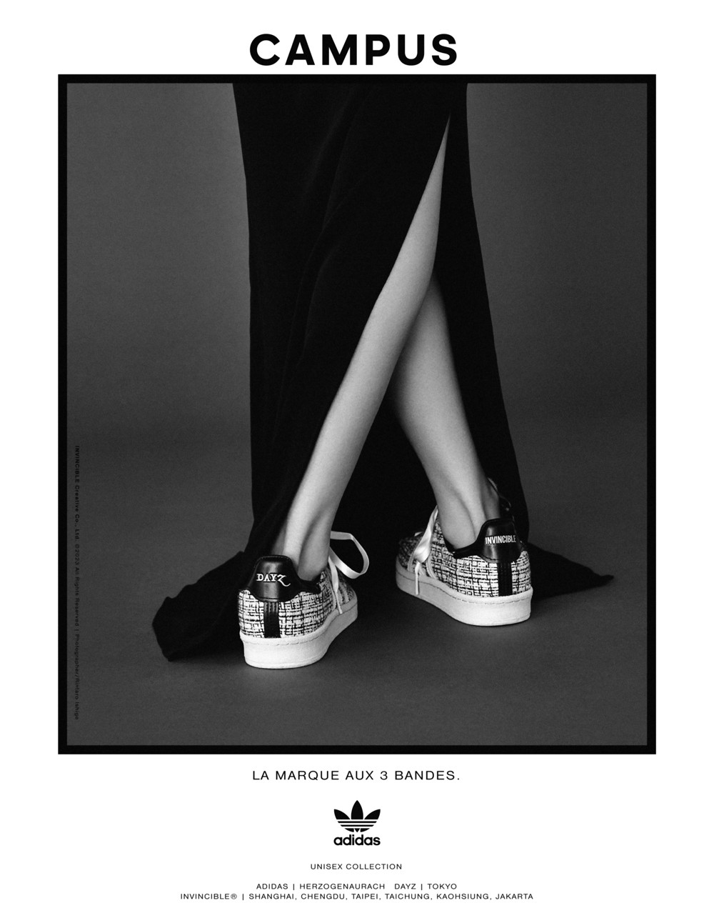 选择以经典鞋型 Campus 为蓝本,共带来黑、白两款配色,其中白色为 INVINCIBLE® 与 DAYZ 的限定发售款。